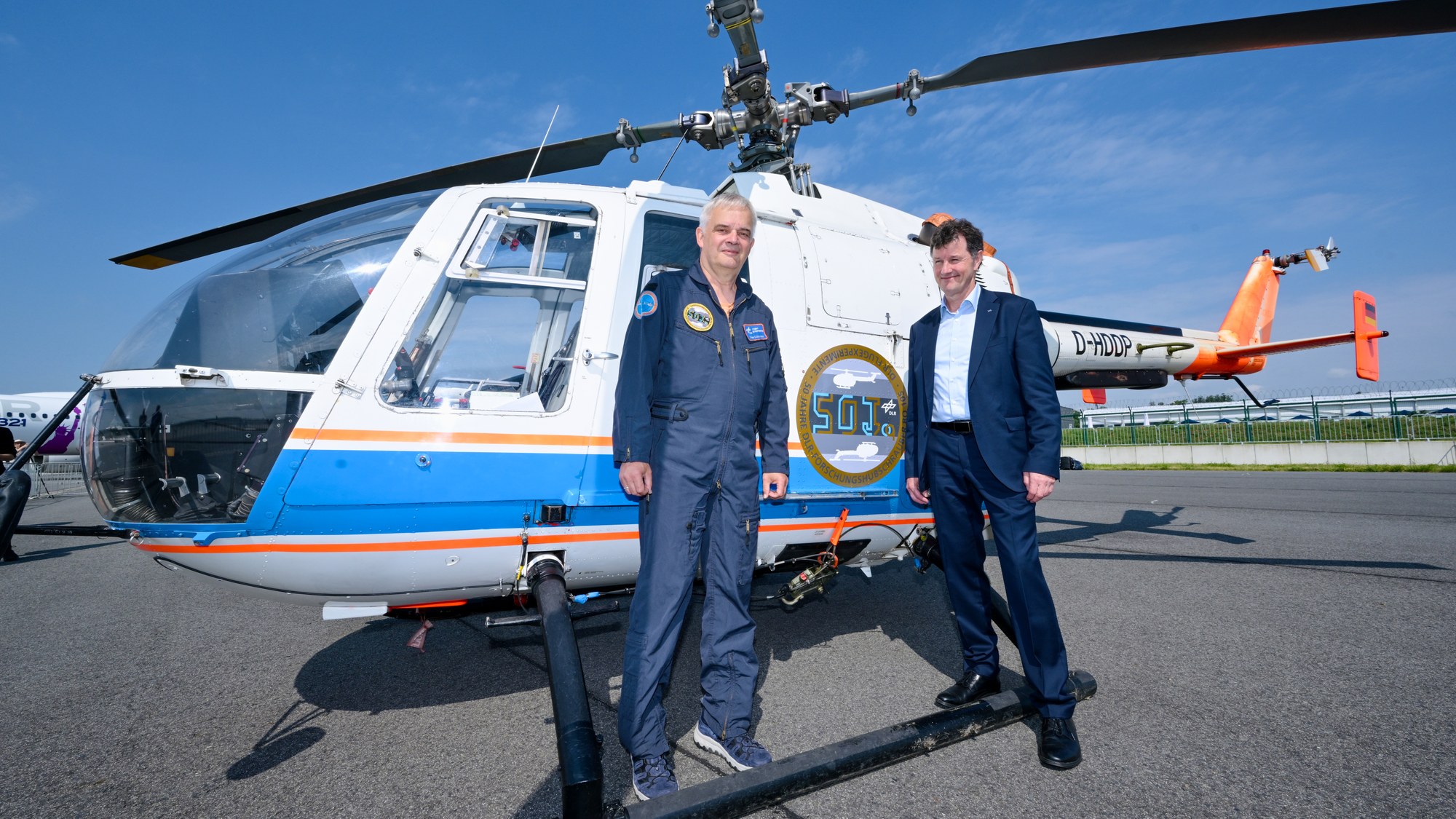 (Von links) DLR-Testpilot Uwe Göhmann und Bereichsvorstand Luftfahrt Dr.-Ing. Markus Fischer vor der BO 105 auf der ILA Berlin 2024