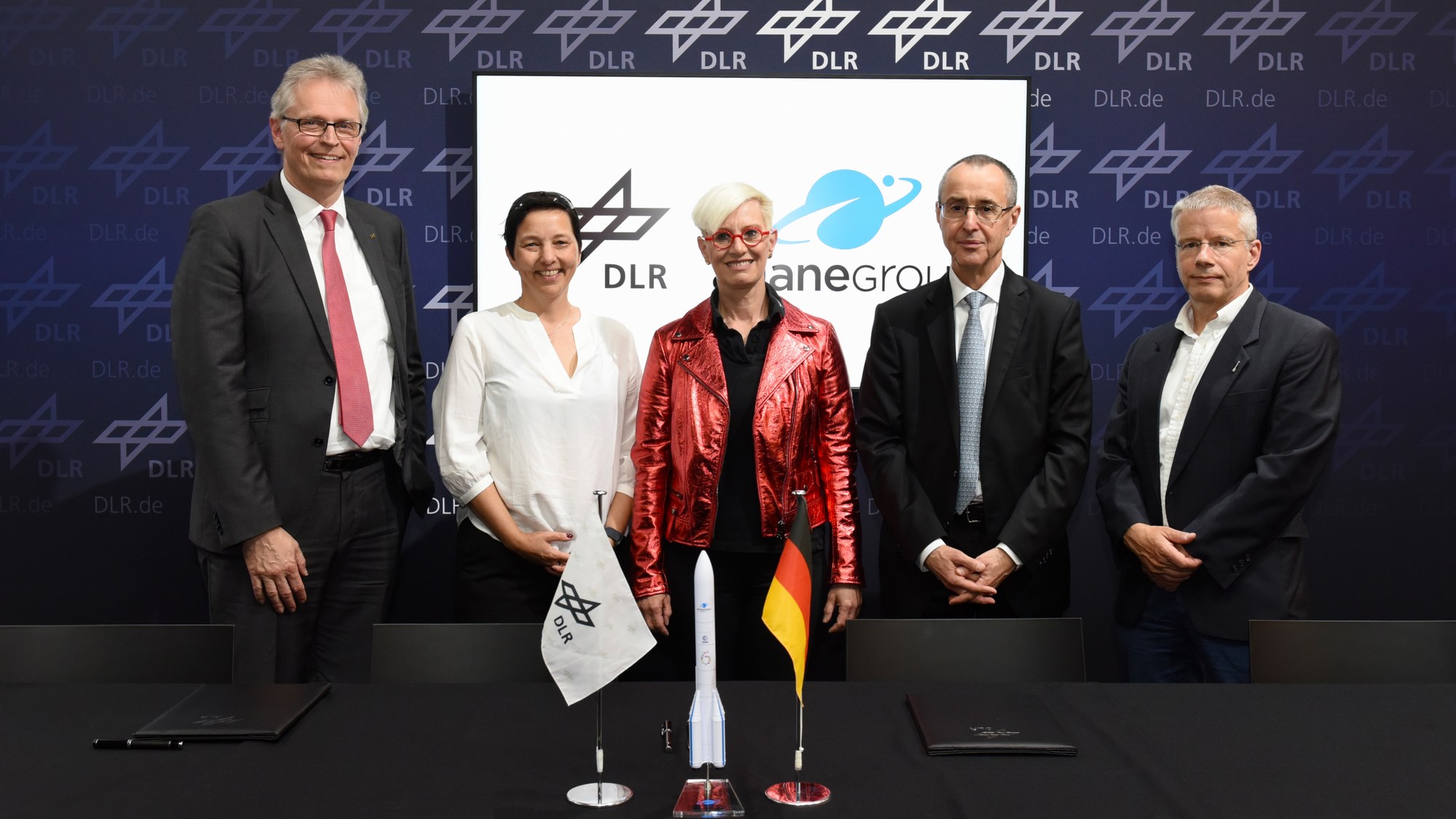 Von links: Prof. Karsten Lemmer (Vorstandsmitglied des DLR für Innovation, Transfer und wissenschaftliche Infrastrukturen), Dr. Anke Pagels-Kerp (Bereichsvorständin Raumfahrt des DLR), Prof. Dr.-Ing. Anke Kaysser-Pyzalla (Vorsitzende des DLR-Vorstands), Pierre Godart (CEO der ArianeGroup GmbH) und Gerald Hagemann (Vice President und Standortleiter Ottobrunn/Taufkirchen)