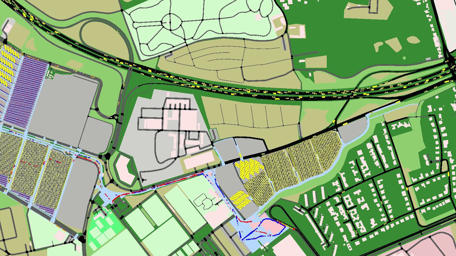 Mit Hilfe der Kopplung zwischen der Verkehrssimulation „SUMO“ und der Simulation der Fußgängerdynamik „JuPedSim“ des Forschungszentrums Jülich werden die Besucherströme zur An- und Abreise rund um das Stadion simuliert.