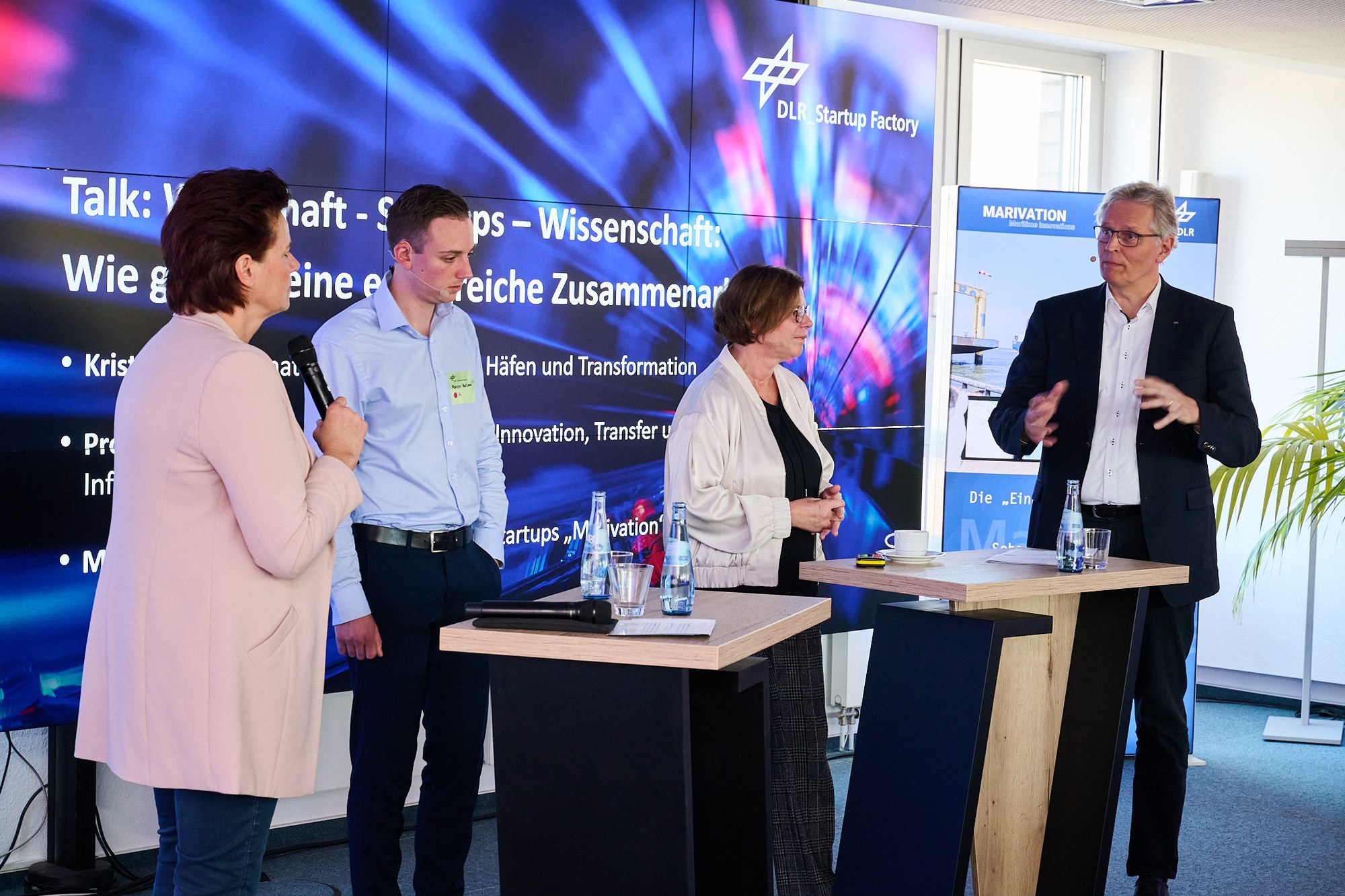 Von links: Daniela Nase, Leitung des Innovations- und Transfermarketings (DLR), Marvin Bathmann, Mitgründer von Marivation, Kristina Vogt, Senatorin für Wirtschaft, Häfen und Transformation, Prof. Karsten Lemmer, DLR-Vorstand für Innovation, Transfer und wissenschaftliche Infrastrukturen.