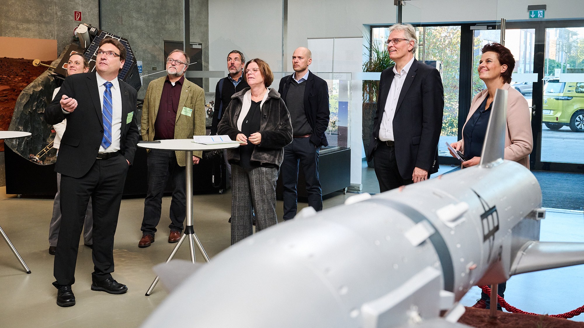 Von links: Prof. Meike List, Direktorin des DLR-Instituts für Satellitengeodäsi und Inertialsensorik, Uwe Knodt, Direktor für administrative Angelegenheiten (DLR), Dr. Lars-Christian Schanz, Leiter der DLR-Standorte Bremen, Bremerhaven, Hamburg und Oldenburg, Kristina Vogt, Senatorin für Wirtschaft, Häfen und Transformation, Prof. Karsten Lemmer, DLR-Vorstand für Innovation, Transfer und wissenschaftliche Infrastrukturen, Daniela Nase, Leitung des Innovations- und Transfermarketings (DLR)