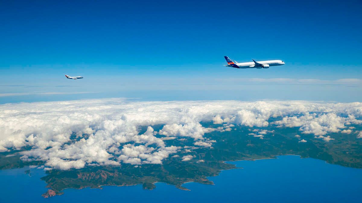 Das DLR-Forschungsflugzeug FALCON 20E folgte dem A350 und analysierte die Emissionen der Triebwerke sowie die Kondensstreifen in neun bis zwölf Kilometer Höhe.