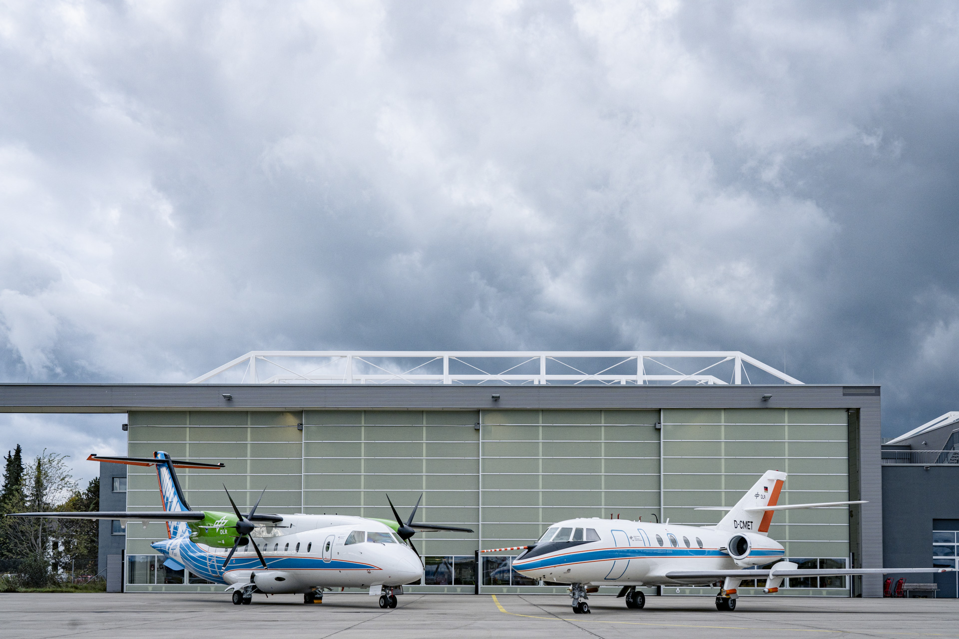 Im Oktober 2024 führen DLR und Deutsche Aircraft weltweit zum ersten Mal Messflüge durch, die die Emissionen eines Turboprop-Flugzeugs mit 100 Prozent synthetischem Kraftstoff untersuchen. Hier stehen beide Flugzeuge vor dem DLR-Hangar am Standort Oberpfaffenhofen.
