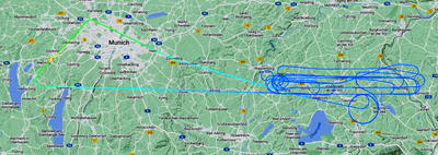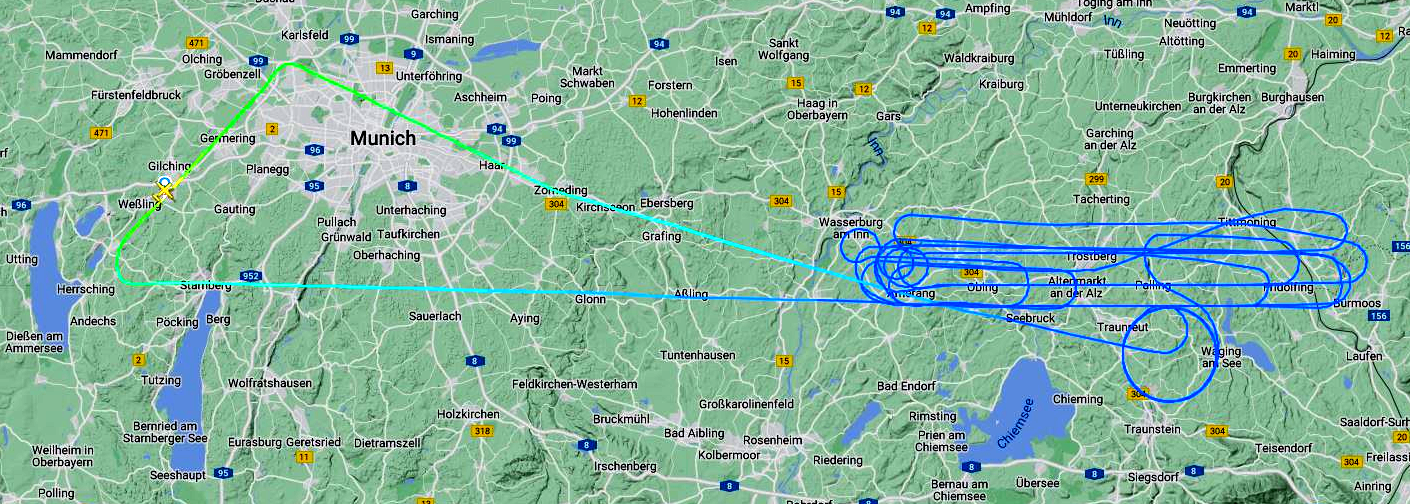 Flugpfad des DLR-Forschungsflugzeugs D-CFFU mit F-SAR Sensor im Testgebiet Traunstein
