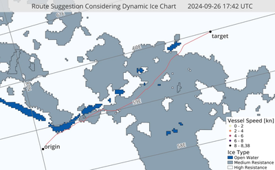 Die Arbeitsgruppe Optimierung und Optimale Steuerung des Zentrums für Industriemathematik der Universität Bremen berechnet eine optimale Route durch driftendes Eis. (Die Eisdrift ist hier nicht dargestellt.)