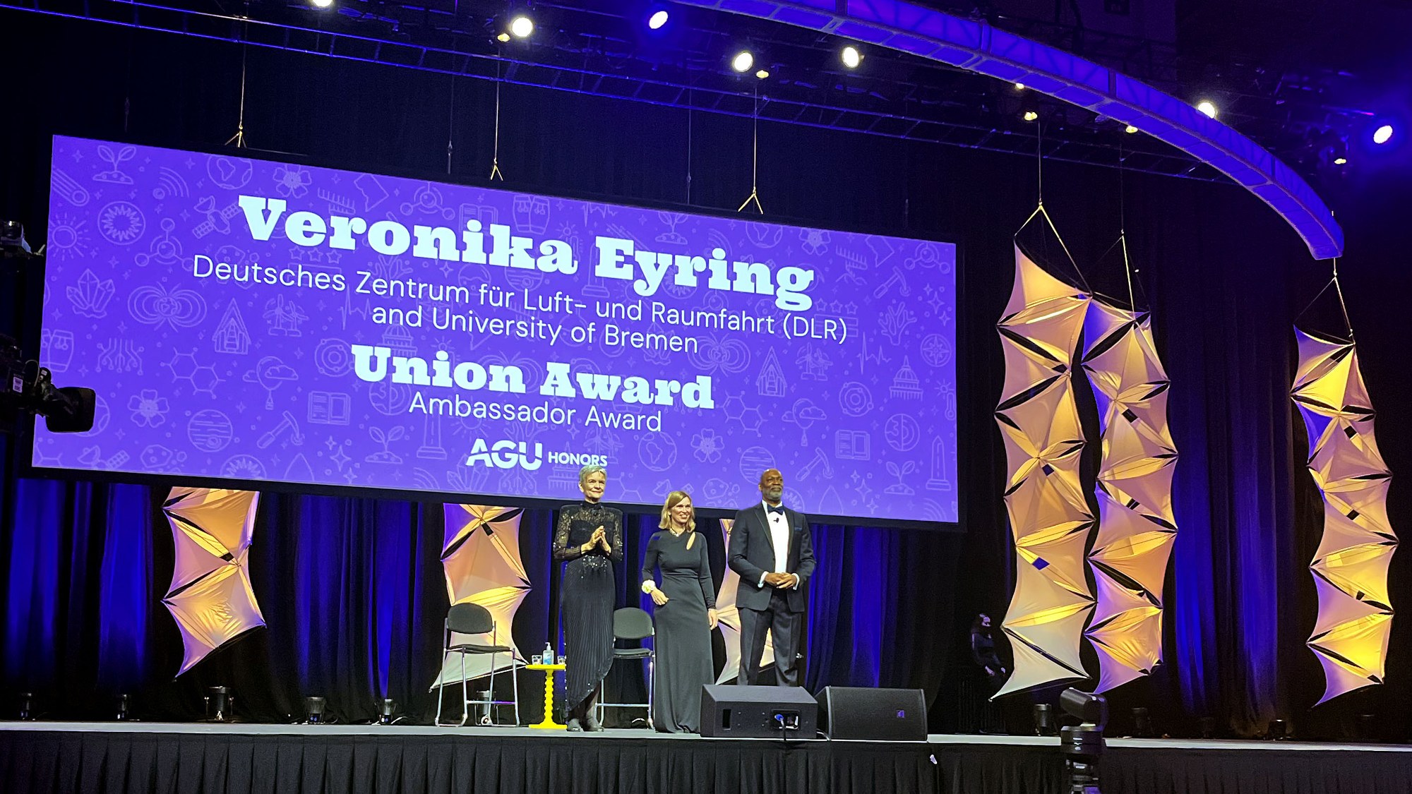 Am 11. Dezember 2024 wurde DLR-Wissenschaftlerin Prof. Veronika Eyring (Bildmitte) der renommierte AGU Ambassador Award verliehen und als Union Fellow der Amerikanischen Geophysikalische Vereinigung (AGU) aufgenommen. Die Verleihung fand in Washington D.C., USA im Rahmen der AGU24 Jahresversammlung mit weltweit insgesamt 25.000 Teilnehmern statt.
