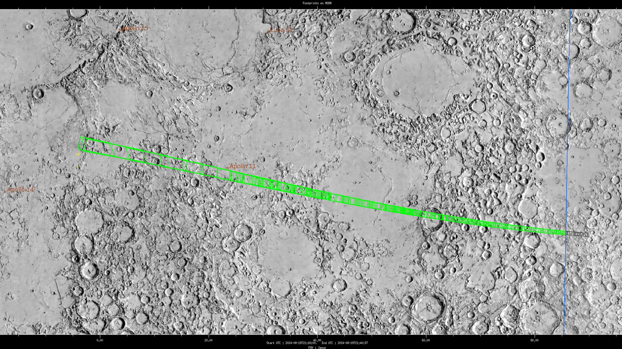 Während der aufeinander folgenden Nahvorbeiflüge an Mond und Erde der Raumsonde JUICE werden auch die wissenschaftlichen Experimente angeschaltet sein. Darunter auch die Kamera JANUS, an der das Deutsche Zentrum für Luft- und Raumfahrt (DLR) maßgeblich beteiligt ist. Während des Mondvorbeiflugs nähert sich JUICE, von der Nachtseite kommend, der Mondoberfläche bis auf 750 Kilometer. Dabei wird die höchste Auflösung der Aufnahmen (grüne Kästchen) etwa 13 Meter pro Bildpunkt betragen. Die zwischen 22:15 und 23:45 Uhr fotografierten Regionen liegen auf einem schmalen Streifen entlang des Äquators sowohl auf der Mondrückseite wie auch auf der Vorderseite, etwas südlich der Apollo-11-Landestelle von 1969. In dieser Nacht ist auch Vollmond.