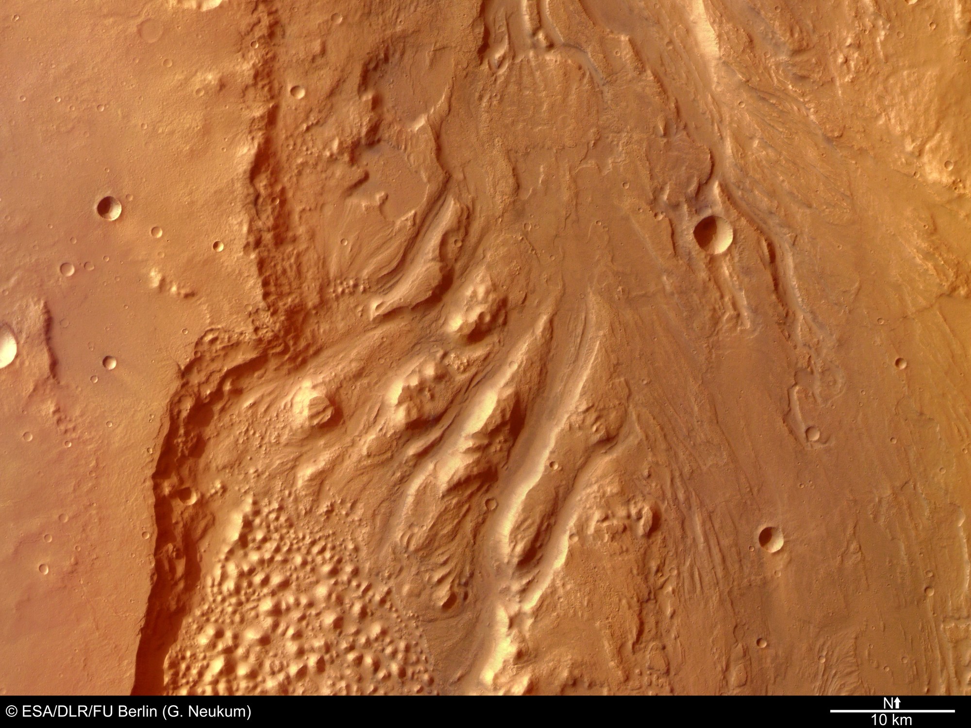 Dieses Bild wurde von der hochauflösenden Stereokamera (HRSC) an Bord der ESA-Raumsonde Mars Express im Oktober 2004 aus einer Höhe von 350 Kilometer mit einer Auflösung von 15 Meter pro Pixel aufgenommen. Es zeigt das Ausflusstal Ares Vallis, das von gewaltigen Wassermassen in der Frühzeit des Mars geschaffen wurde.