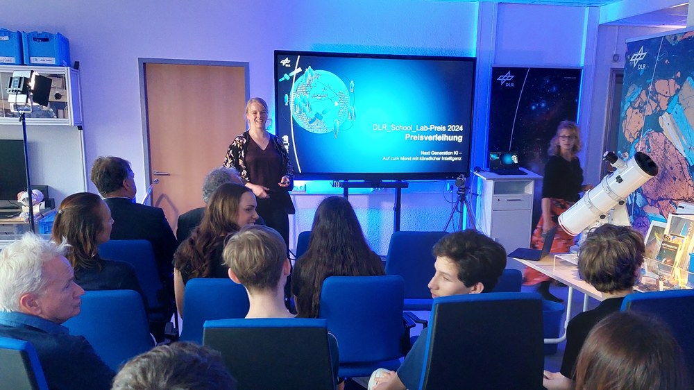 Am 19. Juni 2024 vergab die Gesellschaft von Freunden des DLR e.V. (GvF) den mit 2.500 Euro dotierten DLR_School_Lab-Preis 2024 im DLR_School_Lab Jena. In diesem Jahr drehte sich beim Schülerwettbewerb alles um Künstliche Intelligenz. Die Teams hatten die Aufgabe, eine kreative, aber realistische Geschichte zum Thema „Zurück zum Mond“ mithilfe generativer KIs wie ChatGPT zu schreiben und zu illustrieren. Begleitend mussten sie in einer Ausarbeitung ihre Arbeit und die Methodik kritisch beleuchten und ihre Erkenntnisse zum Umgang mit den Technologien reflektieren.