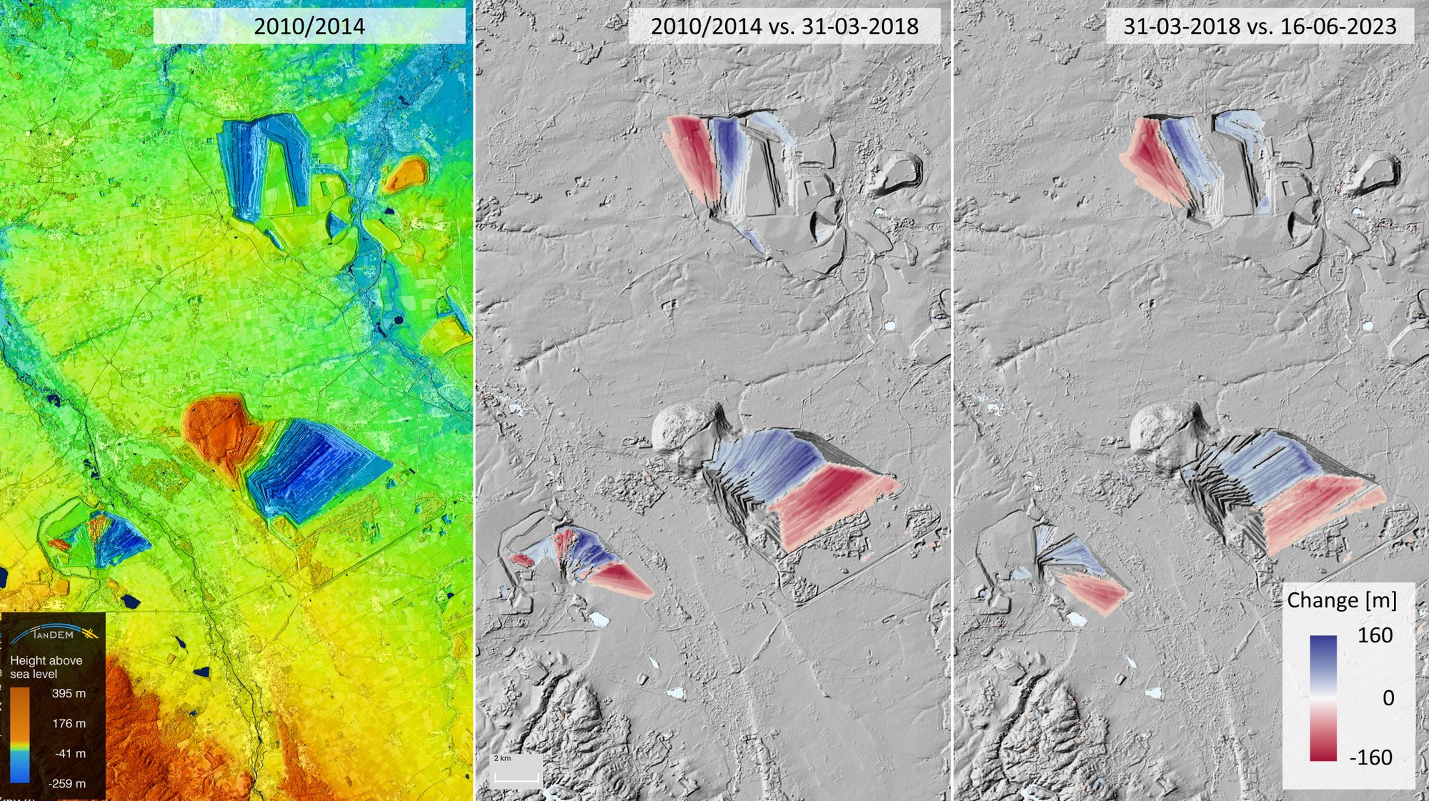 Verglichen werden hier einerseits 2010/2014 mit 2018 sowie andererseits 2018 mit 2023. Höhenveränderungen werden in mehreren Schritten in diesem Zeitraum deutlich. Die roten Stellen im mittleren und rechten Bild zeigen den voranschreitenden Kohleabbau, die blau markierten Stellen die Verschiebung des entstehenden Abraums.