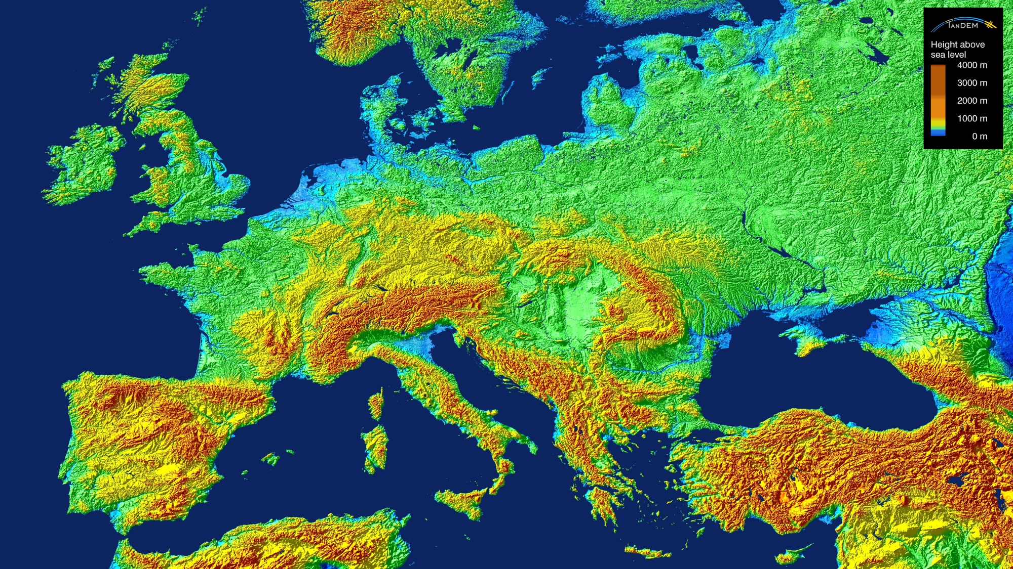 Visualisierung des TanDEM-X-Höhenmodells über Mittel- und Südeuropa