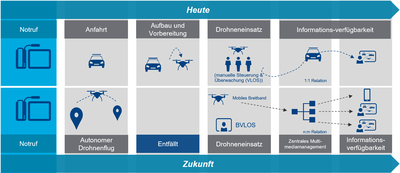 - Drohnen sollen später direkt nach dem Notruf automatisiert zum Einsatzort starten und erste Luftaufnahmen in die Leitstelle der Rettungsdienste senden – noch vor Eintreffen der Einsatzkräfte.