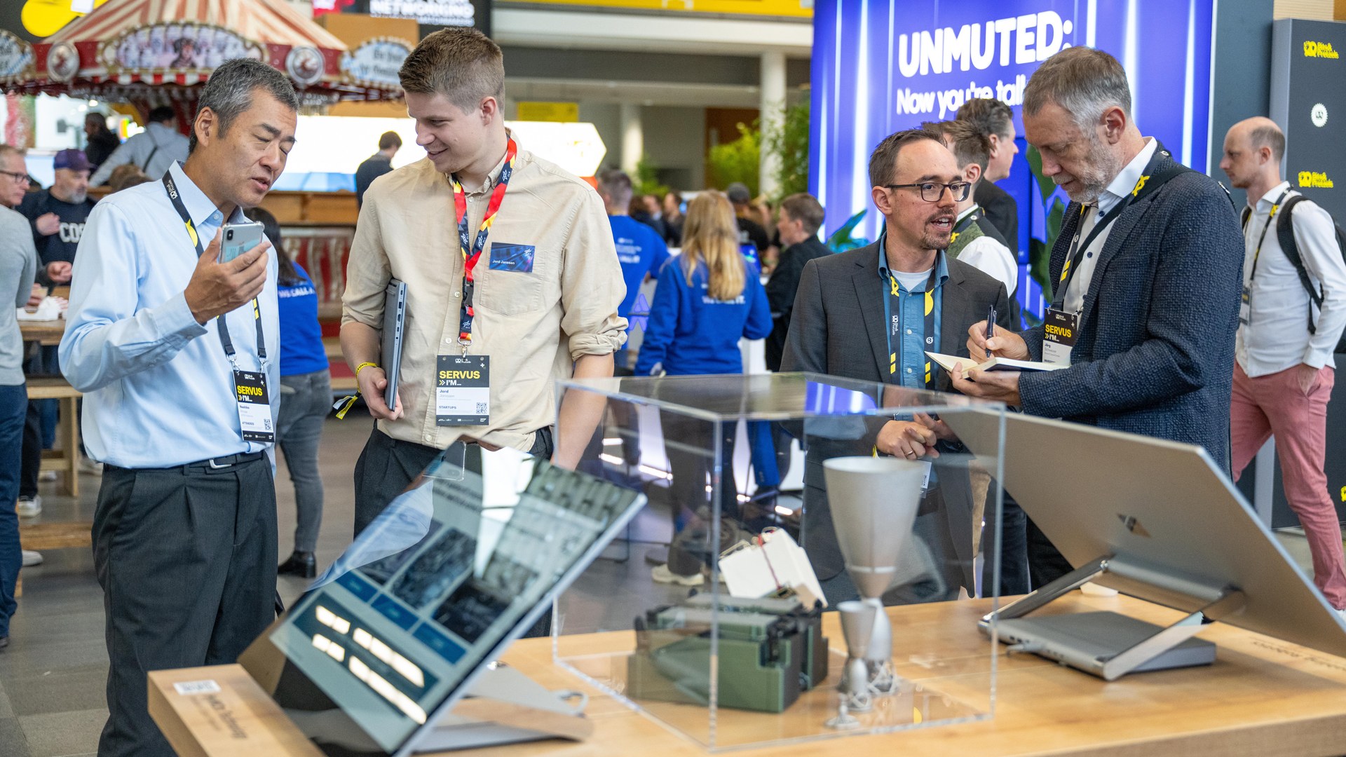 Dr. Lukas Werling (zweiter von rechts), Co-Founder von ISPTech, einer DLR-Ausgründung aus der Einrichtung Raumfahrtantriebe in Lampoldshausen, präsentiert seine effizienten und leistungsstarken Triebwerke und Antriebssysteme für Satelliten und andere Raumfahrzeuge. Sie sind im Vergleich zur Konkurrenz kostengünstiger, einfacher in der Handhabung und schneller verfügbar.