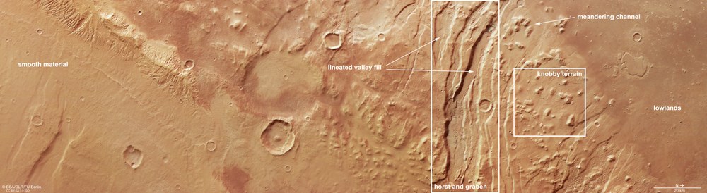 Die Hügel sind auf der rechten Seite des Bildes am deutlichsten zu erkennen. Zur Mitte und zur linken Seite sind immer weniger von ihnen zu sehen. Rund um das hügelige Terrain markieren kleine, schmale, gewundene Rinnen die Oberfläche (siehe kommentiertes Bild). Solche Windungen (fachsprachlich: Mäander) in Rinnen und Kanälen entstehen durch Abtragung und Ablagerung von Material an gegenüberliegenden Talhängen fließender Gewässer, genau wie bei Flussbiegungen auf der Erde.