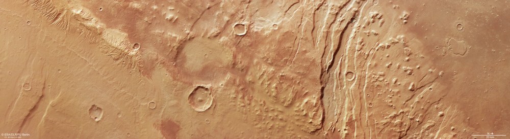 Aktuelle Bilder der hochauflösenden Stereokamera HRSC zeigen den westlichen Teil des riesigen Grabensystems Acheron Fossae auf dem Mars. HRSC ist ein Kameraexperiment, das vom DLR entwickelt wurde und auf der ESA-Mission Mars Express betrieben wird. Die Region im Blickfeld der Kamera befindet sich etwa 1.200 Kilometer nördlich von Olympus Mons – dem höchsten Vulkan in unserem Sonnensystem. Der gesamte bogenförmige Gebirgskamm erstreckt sich über eine Länge von etwa 800 Kilometern. An seiner nördlichen und westlichen Seite geht der Bergrücken in die flachen Ebenen von Arcadia und Amazonis Planitia über. Im Süden berührt das Riftsystem die massiven Ausläufer der Erdrutsche am Fuß der Flanken des Olympus Mons.