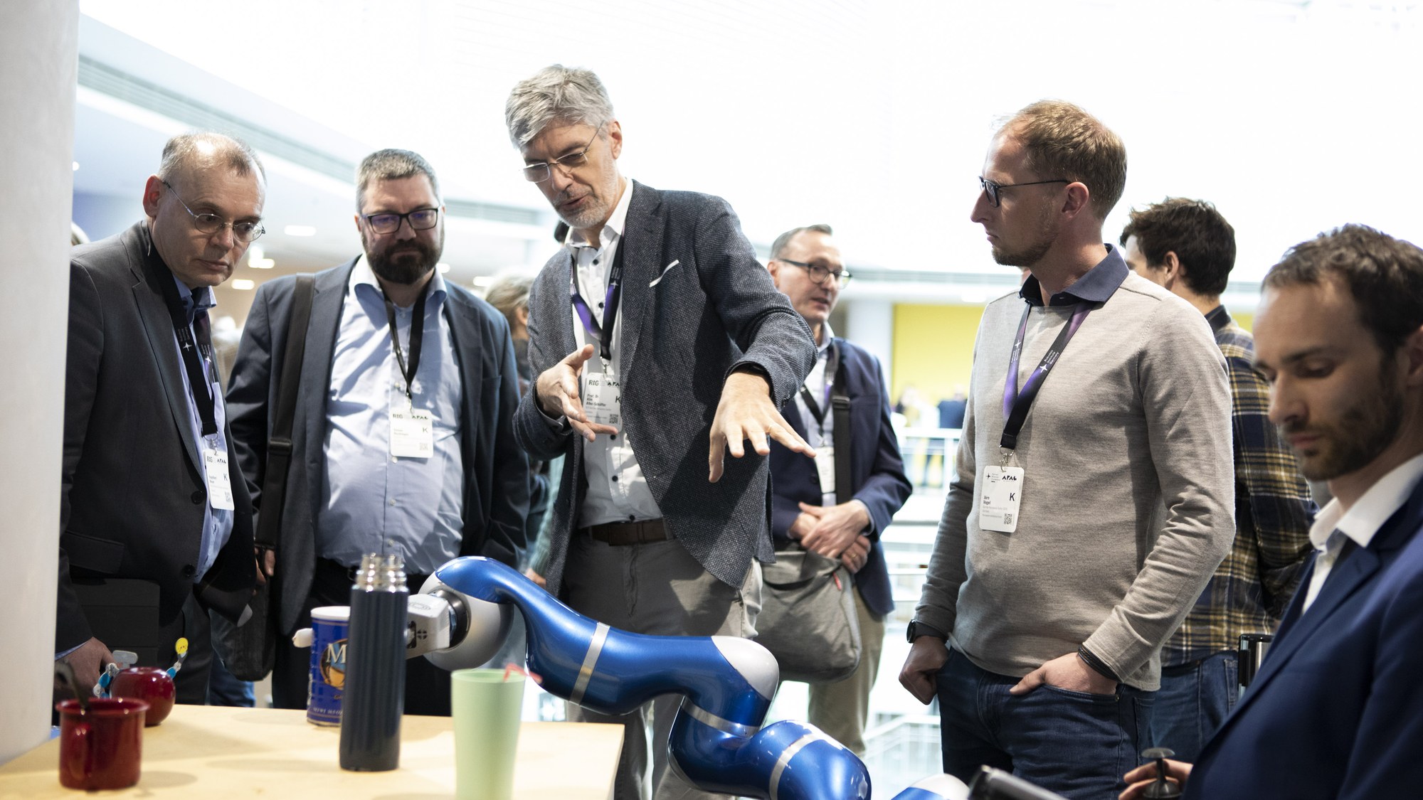 Auf der German Robotics Conference 2025 demonstriert das DLR das Assistenzrobotersystem EDAN (EMG-controlled daily assistant). Der mobile Roboter soll Menschen mit starken motorischen Einschränkungen unterstützen. Die Steuerung des Leichtbau-Roboterarms und der Fünf-Finger-Hand erfolgt mit Hilfe von Muskelsignalen. Durch integrierte Teilautonomie werden alltägliche Aufgaben, erleichtert - hier zum Beispiel das Trinken aus einem Kaffebecher. Im Bild (von links): Ministerialdirektor Engelbert Beyer, Bundesministerium für Bildung und Forschung, Regierungsdirektor Simon Hechinger, Bundesministerium für Bildung und Forschung, Institutsdirektor Prof. Alin Albu-Schäffer, DLR-Institut für Robotik und Mechatronik, Jörn Vogel, DLR-Institut für Robotik und Mechatronik.