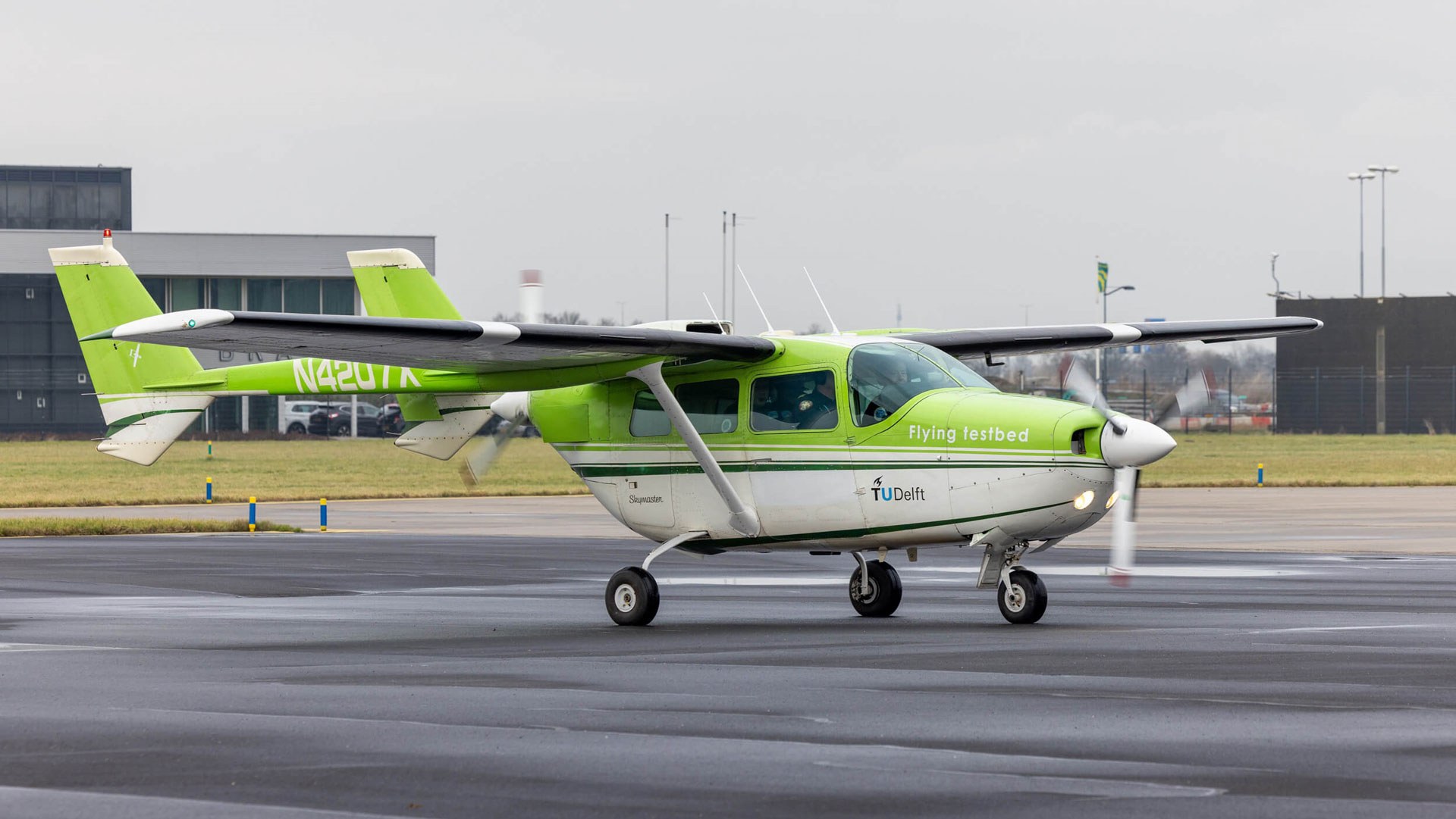 Die Flugversuche am Flughafen Magdeburg-Cochstedt finden mit einer Cessna F337F Super Skymaster der TU Delft statt.