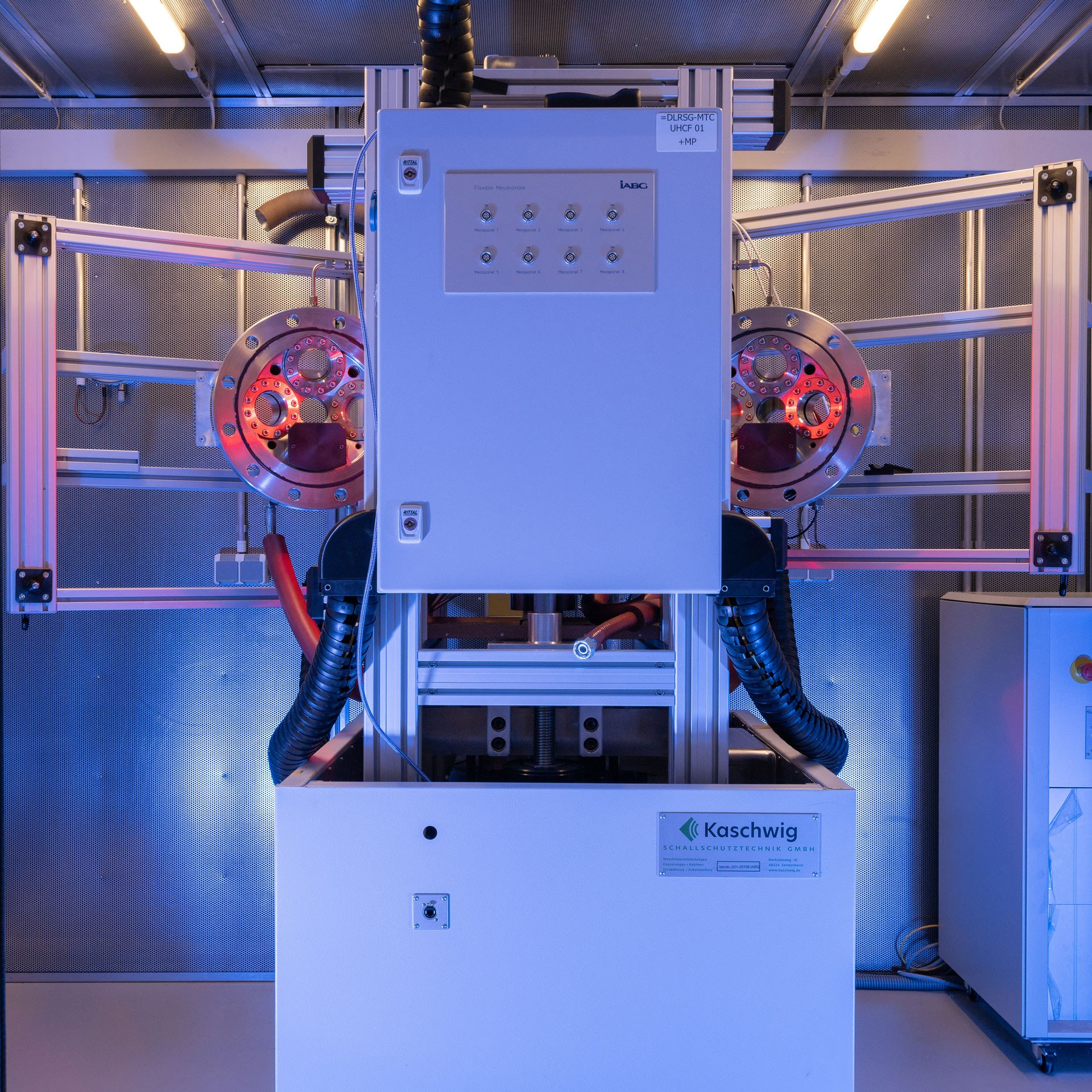 Der MTC-VHCF-Prüfstand (Very High Cycle Fatigue) eignet sich auf Grund der hohen Testfrequenz von 1.000 Hertz besonders für Lebensdauertests mit einer sehr hohen Zahl an Lastwechseln. Im Bild sind vier kreisförmige optische Zugänge zum Druckbehälter zu erkennen. Die unterschiedlichen Färbungen der Fenster deuten deren unterschiedlichen Oberflächenbeschichtungen an – angepasst auf die im nächsten Schritt zu installierende optische Messtechnik sowie des Laserheizsystems.