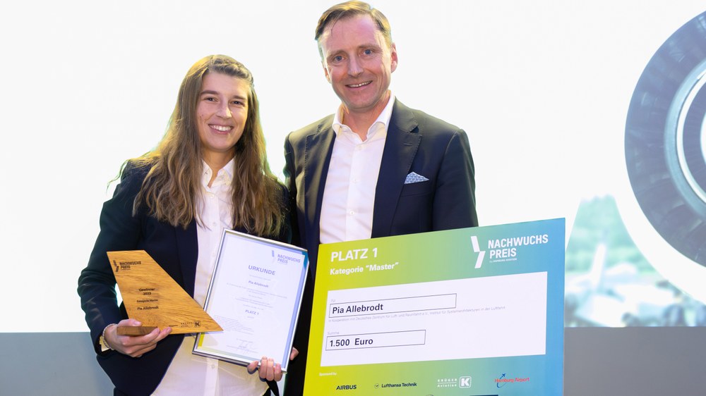 Pia Allebrodt vom DLR-Institut für Systemarchitekturen in der Luftfahrt ist für ihre Masterarbeit an der Technischen Universität Braunschweig mit dem ersten Platz in der Kategorie „Master“ prämiert. Mit ihrer Arbeit entwickelte sie eine Entwurfsmethodik für leise Passagierkabinen in gleichzeitig klimaverträglichen und effizienten Flugzeugen.