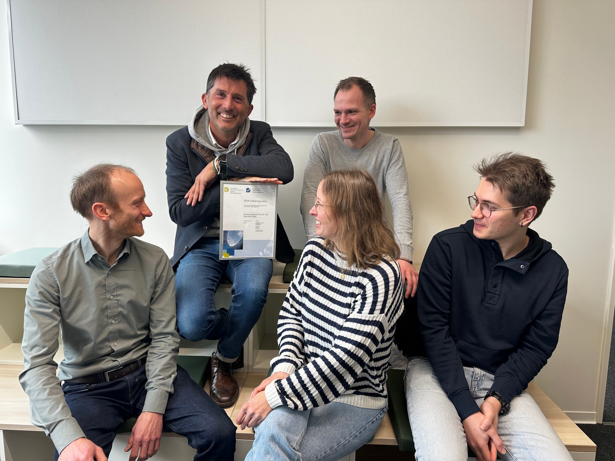 Der Nachhaltigkeitsbeauftragte des DLR, Philipp Bergeron (oben links) - hier mit dem Großteil seines Teams - freut sich über die in den vergangenen Jahren erzielten Fortschritte.