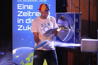 Die DLR_Raumfahrt_Show geht wieder auf Tour: Unter dem Motto „Eine Zeitreise in die Zukunft“ lädt das interaktive Bühnenprogramm Schülerinnen und Schüler zu einem faszinierenden Ausflug in die Welt von morgen ein. Wird es irgendwann Weltraum-Hotels geben? Oder Forschungsstationen auf dem Mond oder Mars? Neben spannenden Fragen rund um die Raumfahrt behandelt die ebenso lehrreiche wie unterhaltsame Präsentation auch andere Themen und Projekte aus dem Deutschen Zentrum für Luft- und Raumfahrt (DLR) – von den Flugzeugen der nächsten Generation bis zur Verkehrs- und Energieforschung.