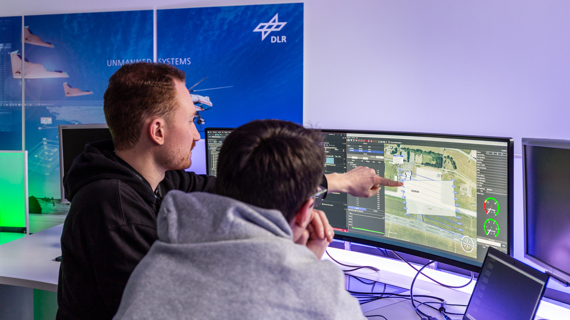 Zwei Teilnehmende der ASDA Spring School erstellen im Drohnen-Labor des DLR-Instituts für Flugführung eine Flugroute und optimieren den Einsatz in der Simulation.
