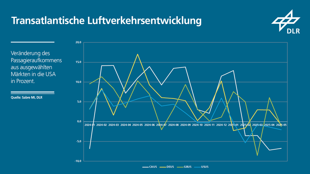 Das Deutsche Zentrum für Luft- und Raumfahrt (DLR) hat die Entwicklung der Passagierzahlen mit Start beziehungsweise Ziel in den USA für den Zeitraum Januar 2024 bis Mai 2025 untersucht. Im Fokus standen dabei die Luftverkehrsbeziehungen zwischen den USA und Deutschland, Großbritannien, Kanada und China sowie der amerikanische inländische Markt. Aus deutscher Sicht ist kein längerfristiger Einfluss der aktuellen US-Politik auf die Luftverkehrsentwicklung festzustellen.