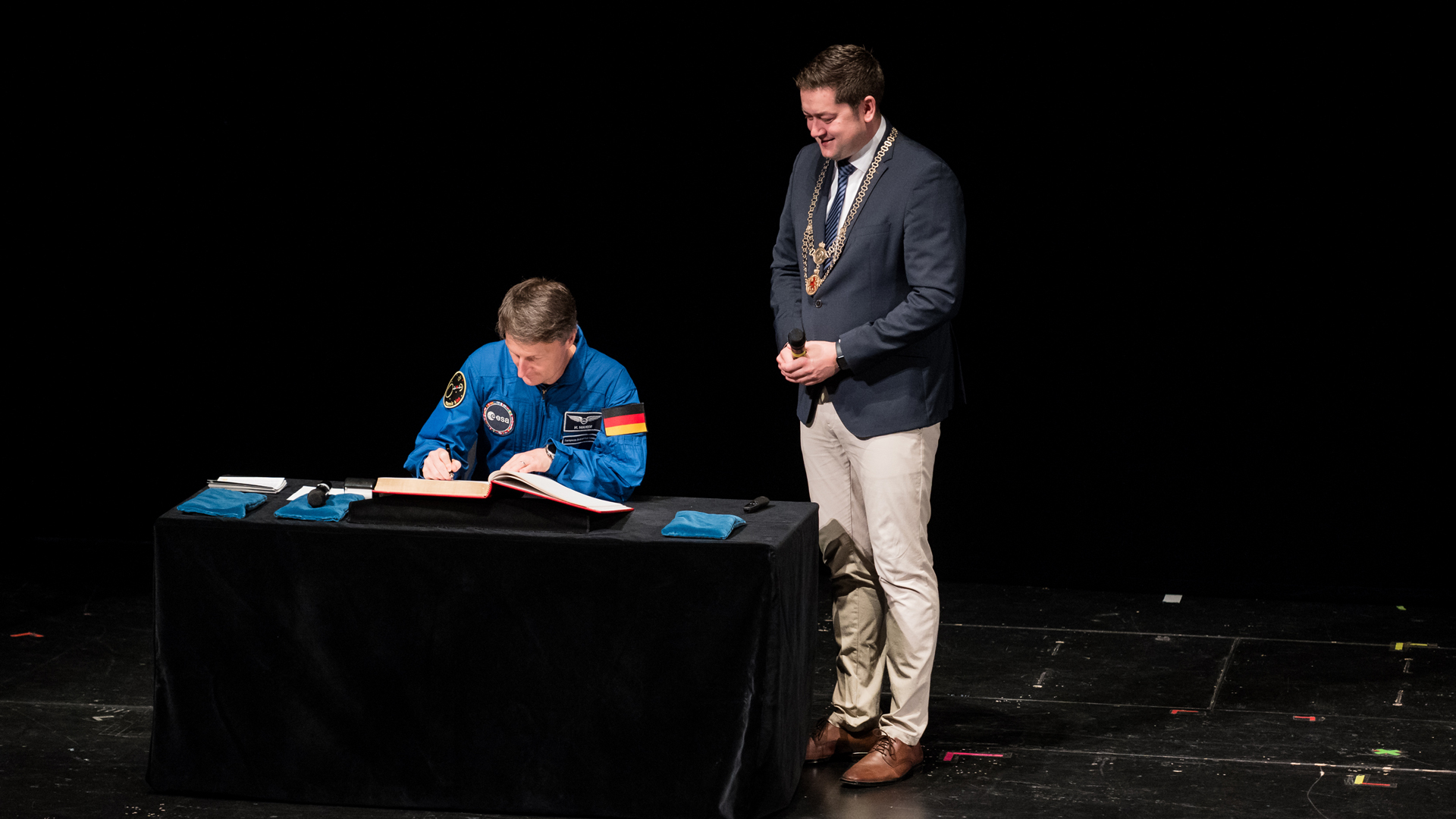 Als erster Astronaut durfte sich Matthias Maurer im Rahmen der Veranstaltung in das Goldene Buch der Stadt Braunschweig eintragen. Von links: ESA-Astronaut Matthias Maurer und Dr. Thorsten Kornblum, Oberbürgermeister der Stadt Braunschweig.