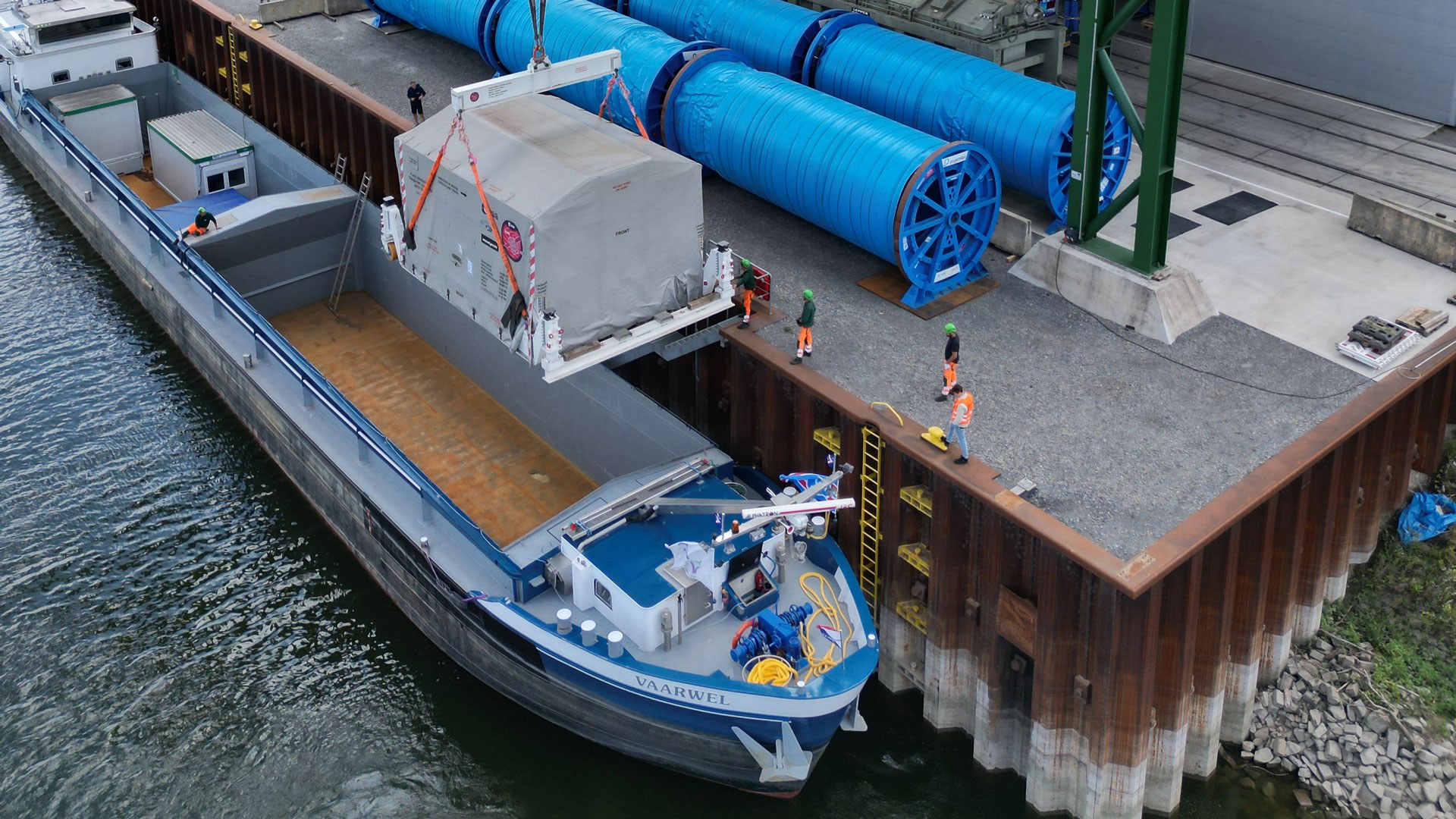 Am 22. August 2025 wurde ein Container mit dem PLATO-Weltraumteleskop der Europäischen Weltraumorganisation ESA in Mannheim auf ein Schiff verladen, um über den Rhein zum ESTEC der ESA in den Niederlanden transportiert zu werden.