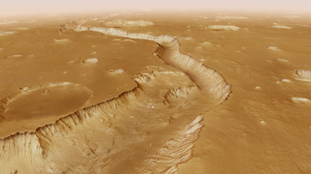 In Richtung Norden beginnt die Reise mit dem Flug über das Shalbatana Vallis. Große Wassermassen erodierten einst dieses tiefe Tal in die Marsoberfläche. Bevor es das Tiefland von Chryse Planitia erreicht, windet es sich über mehr als 1.300 Kilometer durch das Hochland. Dies ist ein klein wenig mehr als der Länge des Rheins von seinem Ursprung in der Schweiz bis zu seiner Mündung in die Nordsee. Man geht davon aus, dass Shalbatana Vallis zwischen dem mittleren und späten Hesperium entstand, also vor etwa 3,5 Milliarden Jahren. Während der Flug dem Tal nach Norden folgt, säumen zahlreiche Einschlagskrater unterschiedlicher Größe die Flugroute – ein charakteristisches Merkmal der alten noachischen Landschaften, die einige Zeit früher, nämlich vor circa vier Milliarden Jahren, entstanden sind.