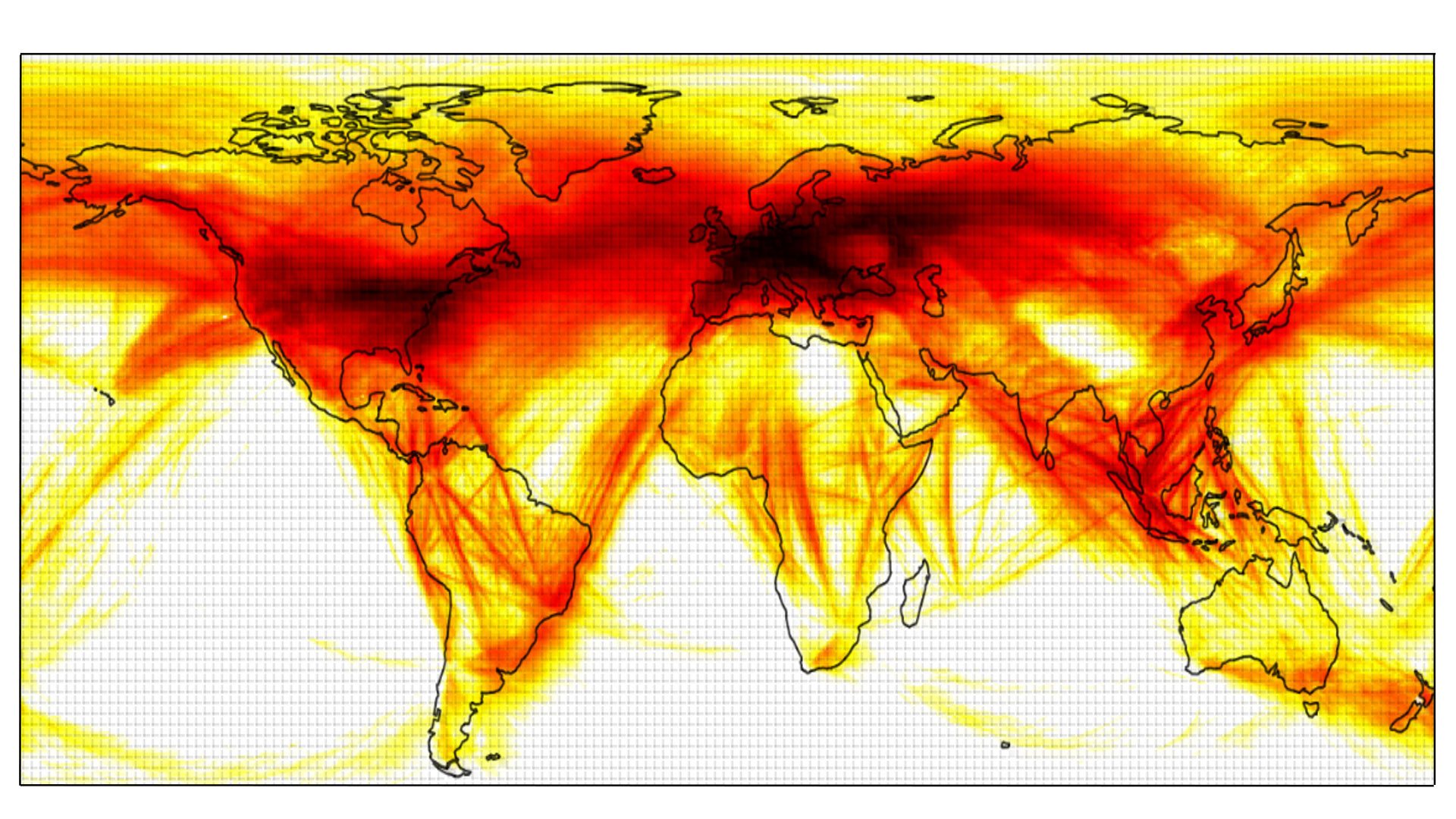 Die Grafik gibt einen weltweiten Überblick über den Strahlungsantrieb von Kondensstreifen im Jahr 2019. Dunklere Rottöne zeigen eine stärkere Erwärmung durch Kondensstreifen.