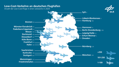 Während der Low-Cost-Anteil an den großen Drehkreuzen Frankfurt und München unter fünf Prozent liegt, beträgt er an Flughäfen wie Berlin, Düsseldorf, Stuttgart und Köln jeweils über 40 Prozent. An kleineren Flughäfen wie Memmingen, Niederrhein (Weeze), Hahn und Karlsruhe liegt der Anteil sogar bei über 90 Prozent. Berlin war in der betrachteten Juliwoche 2025 mit 855 wöchentlichen Low-Cost-Starts führend, gefolgt von Düsseldorf, Köln, Hamburg und Stuttgart.