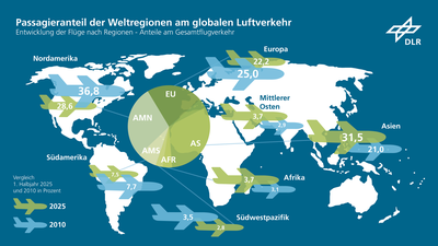 Der weltweite Luftverkehr lag im Sommer 2025 über dem Vorkrisenniveau. Asien ist dabei die größte Marktregion. Der Anteil von Low-Cost-Flügen am weltweiten Luftverkehr bleibt dabei hoch, entwickelt sich regional jedoch sehr unterschiedlich. Weltweit entfallen rund 31 Prozent des Angebots im Passagierluftverkehr auf das Low-Cost-Segment. In Europa sind es etwa 36 Prozent, wobei Deutschland mit rund 26 Prozent deutlich unter diesem Durchschnitt liegt. Im rein innerdeutschen Luftverkehr sind es nur noch etwa acht Prozent. Das zeigt die neue, zweite Ausgabe der Reihe MONITOR Luftverkehr und Low-Cost des Deutschen Zentrums für Luft- und Raumfahrt (DLR).