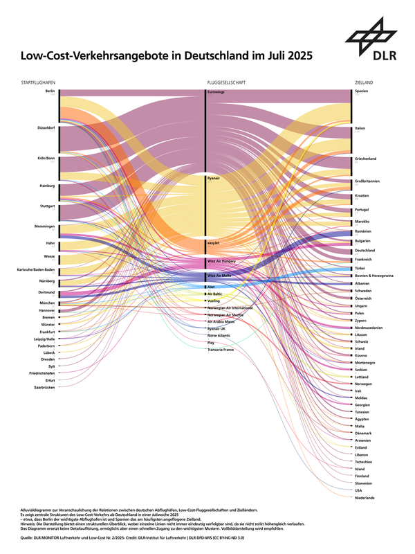 Auch wenn Low-Cost-Fluggesellschaften nach wie vor typische Merkmale wie niedrige Preise, Direktvertrieb über das Internet und Punkt-zu-Punkt-Verbindungen aufweisen, lassen sie sich heute kaum noch klar vom restlichen Markt abgrenzen. Viele Fluggesellschaften verfolgen inzwischen hybride Geschäftsmodelle, die Elemente traditioneller Netzwerk- oder Touristik-Fluggesellschaften integrieren. Für die Analysen des DLR werden Fluggesellschaften dem Low-Cost-Segment zugeordnet, wenn ihr Angebot überwiegend preisgünstig und allgemein zugänglich ist. Die aktuellen Auswertungen basieren auf Daten einer Referenzwoche im Juli 2025, Preisabfragen aus dem September 2025 und dem DLR Global Aviation Monitor für Dezember 2025.