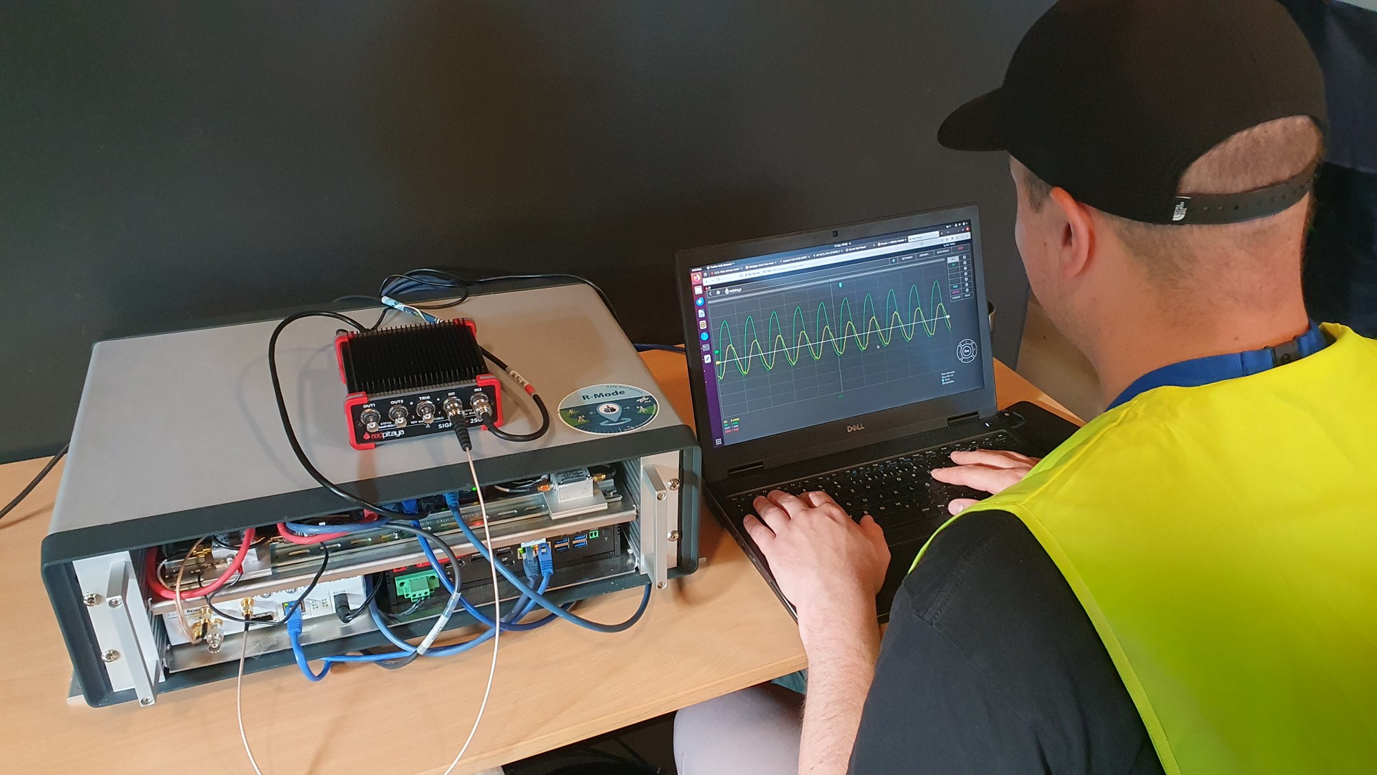 Ein DLR-Mitarbeiter vergleicht das aus dem empfangenen R-Mode-Signal abgeleitete 10-Megahertz-Signal mit einer bereitgestellten 10-Megahertz-Referenz. Der R-Mode Empfänger befindet sich in dem kleinen „Kasten“.