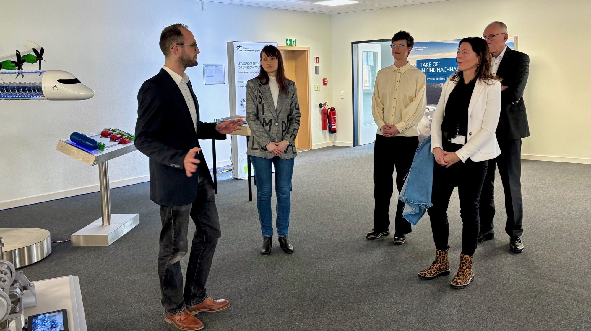 Von links: Johannes Oehler, DLR-Institut für CO2-arme Industrieprozesse, Helen Müller, DLR-Institut für CO2-arme Industrieprozesse, Stefanie de Graaf, DLR-Institut für Elektrifizierte Luftfahrtantriebe, Bürgermeisterin Doreen Mohaupt, Prof. Uwe Riedel, DLR-Institut für CO2-arme Industrieprozesse.