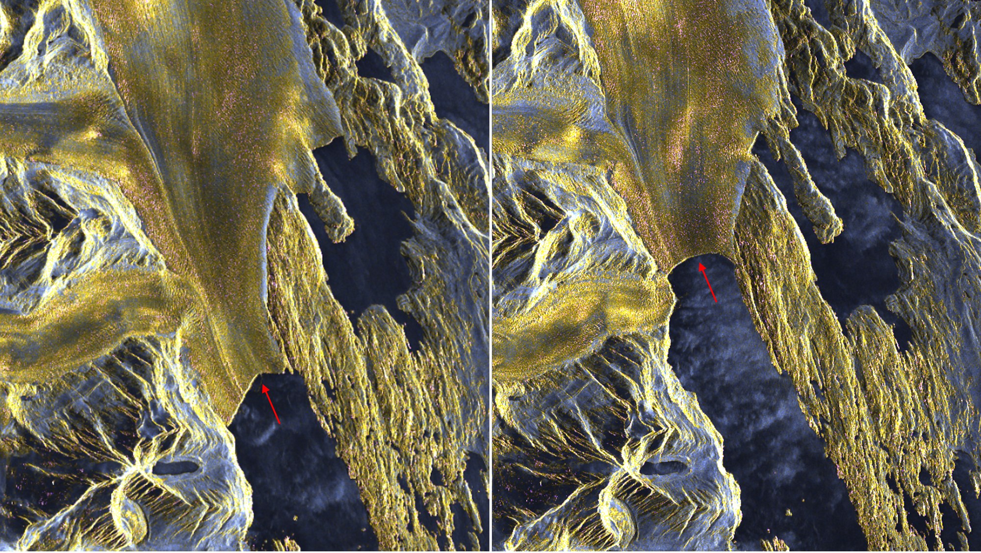 Im südlichen Teil der Anden befinden sich eine Reihe von Gletschern – Überreste des sogenannten glazialen Patagonischen Eisschildes. Die Regionen Campo de Hielo Sur und Campo de Hielo Norte sind die größten vergletscherten Gebiete der Südhalbkugel, mit Ausnahme der Antarktis. Im argentinischen Teil Patagoniens befindet sich der Nationalpark Los Glaciares, der zum Weltnaturerbe gehört. Dieser besteht zum Großteil aus den drei Gletschern Perito Moreno, Viedma und eben Upsala. Die roten Pfeile markieren dessen Abbruchkante 2008 (links) und 2022 (rechts).