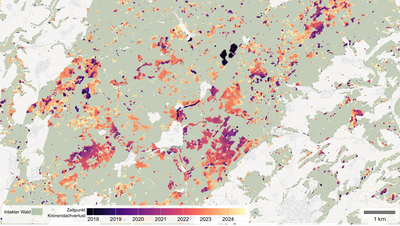 EO Wald bietet Ansichten und Vergleiche auf Pixelebene sowie auf Ebene der Bundesländer, Landkreise und Gemeinden. Eine Zeitachse zeigt den prozentualen Anstieg der Kronendachverluste im jeweils ausgewählten Gebiet pro Monat. Nutzerinnen und Nutzer können die Zeiträume auch anpassen oder bestimmte Gebiete im monatlichen, saisonalen sowie jährlichen Überblick betrachten. Dank der räumlich und zeitlich hohen Auflösung lässt sich auf den Karten nachvollziehen, wo es wann zu welchen Verlusten kam. Dies hilft auch, die Ursachen besser zu identifizieren. Verluste, die sich zum Beispiel kreisförmig ausbreiten, deuten auf Schädlinge hin, geometrische Flächen hingegen auf Ernten. Durch die genauen zeitlichen Informationen lassen sich verschiedene Ereignisse exakt verorten wie zum Beispiel Waldbrände, Sturmereignisse oder gezielte Maßnahmen zum Ausbau von Infrastruktur.