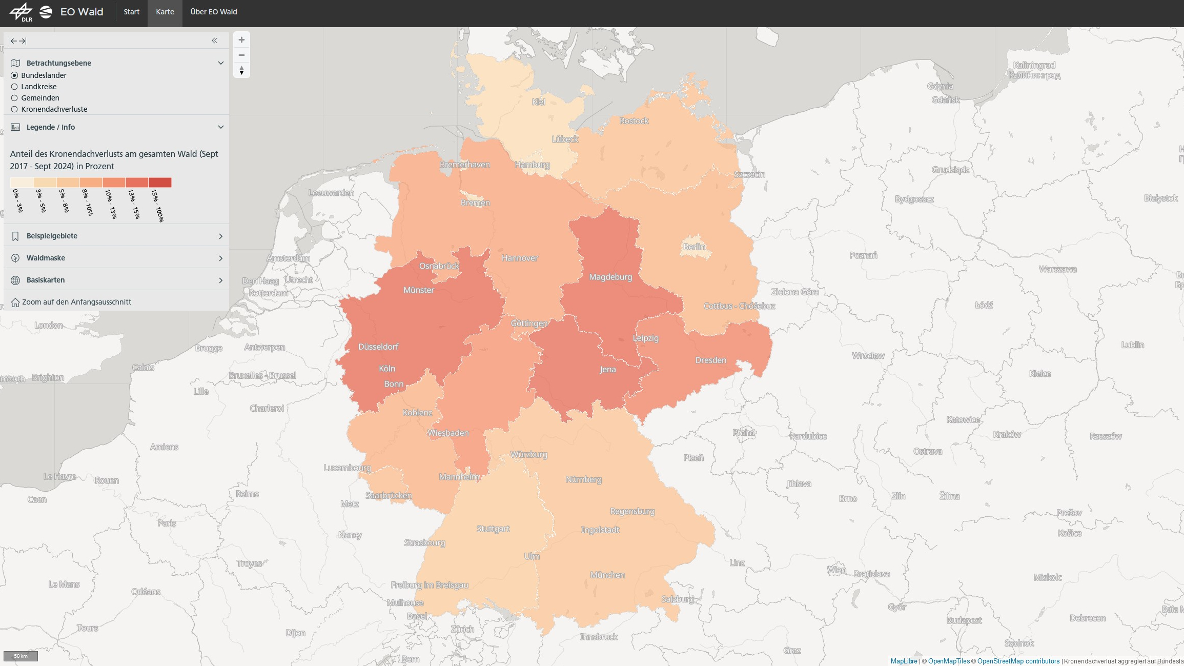 Ungewöhnlich starke Dürreperioden, Hitzewellen und Stürme haben Deutschlands Wälder in den vergangenen Jahren zugesetzt. Die gestressten Bäume sind zudem anfällig für Schädlinge, so dass vielerorts Bäume absterben und teilweise großflächig notgefällt werden müssen. Mit Laien-verständlich aufbereiteten Karten eröffnet EO Wald dazu einzigartige Einblicke. Das neue Datenportal wurde am Earth Observation Center (EOC) des DLR entwickelt und im Rahmen des Projekts ForstEO validiert.