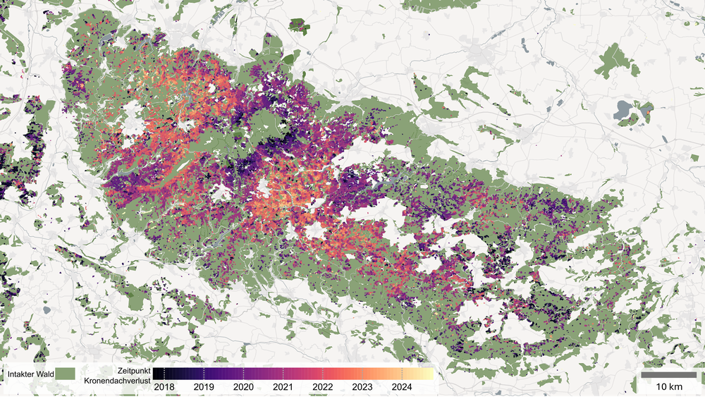 „Umwelteinflüsse und Schädlingsbefall haben in unseren Wäldern deutliche Spuren hinterlassen. Durch die Nutzung von Satellitendaten können wir in kurzen zeitlichen Abständen und hoher räumlicher Auflösung das Kronendach der Wälder erfassen . In unserem neuen Webdienst EO Wald haben wir die raum-zeitliche Dynamik der Kronendachverluste visualisiert“, erläutert Prof. Dr.-Ing. Anke Kaysser-Pyzalla, Vorstandsvorsitzende des DLR. „Mit dieser großflächigen Verarbeitung von Massendaten hin zu einer breiten Palette an Informationsprodukten unterstützen wir Forst- und Wirtschaftsbetriebe, sowie andere öffentliche Stakeholder in ihrer Arbeit. So können Waldschäden gezielt quantifiziert und prognostiziert werden. Daraus abgeleitete Maßnahmen helfen, unsere Wälder zu schützen und zu erhalten.“