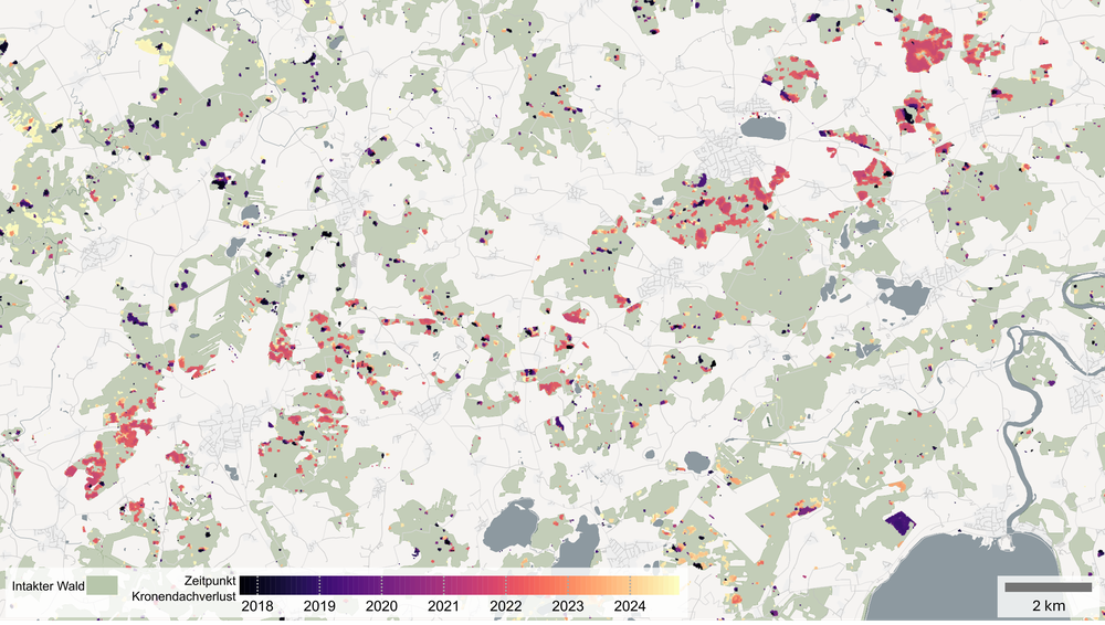 Das DLR ist deutschlandweit führend im Bereich der Big Data Analyse von großflächigen Erdbeobachtungsdaten und deren Veredelung zu einer breiten Palette an Informationsprodukten. Für die Berechnung der Kronendachverluste nutzten die Forschenden unter anderem Daten der Sentinel-2-Satelliten des europäischen Copernicus-Programms sowie der amerikanischen Satelliten Landsat-8 und -9.