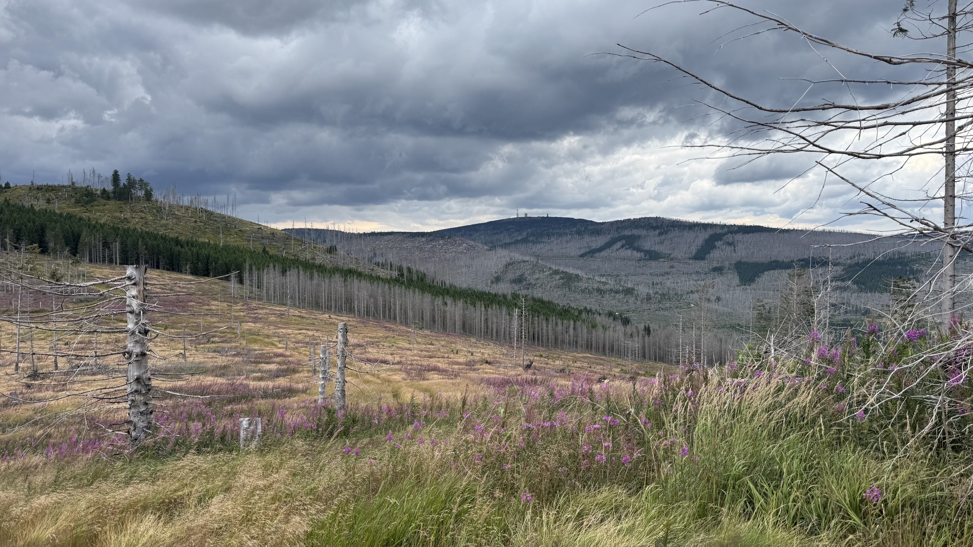 Das Bild verdeutlicht die Folgen eines Borkenkäfer-Befalls. Die betroffenen Bäume werden mit schweren Erntemaschinen möglichst vollständig entnommen. Der Kahlschlag wird als letztes Mittel eingesetzt, um dem Borkenkäfer die Nahrung zu entziehen und dadurch seine weitere Ausbreitung zu verhindern. Anfällig sind insbesondere Fichten, die in Deutschland nach dem Zweiten Weltkrieg weitflächig als Holzlieferant gepflanzt wurden. Das Bild wurde im Juli 2025 aufgenommen, im Waldgebiet von Schierke bei Wernigerode im Harz, Sachsen-Anhalt. Im Bildhintergrund sind Teile des Nationalparks Harz zu sehen, in dessen Kernzone keine Bewirtschaftung stattfindet und die abgestorbenen Bäume als stehendes Totholz verbleiben.