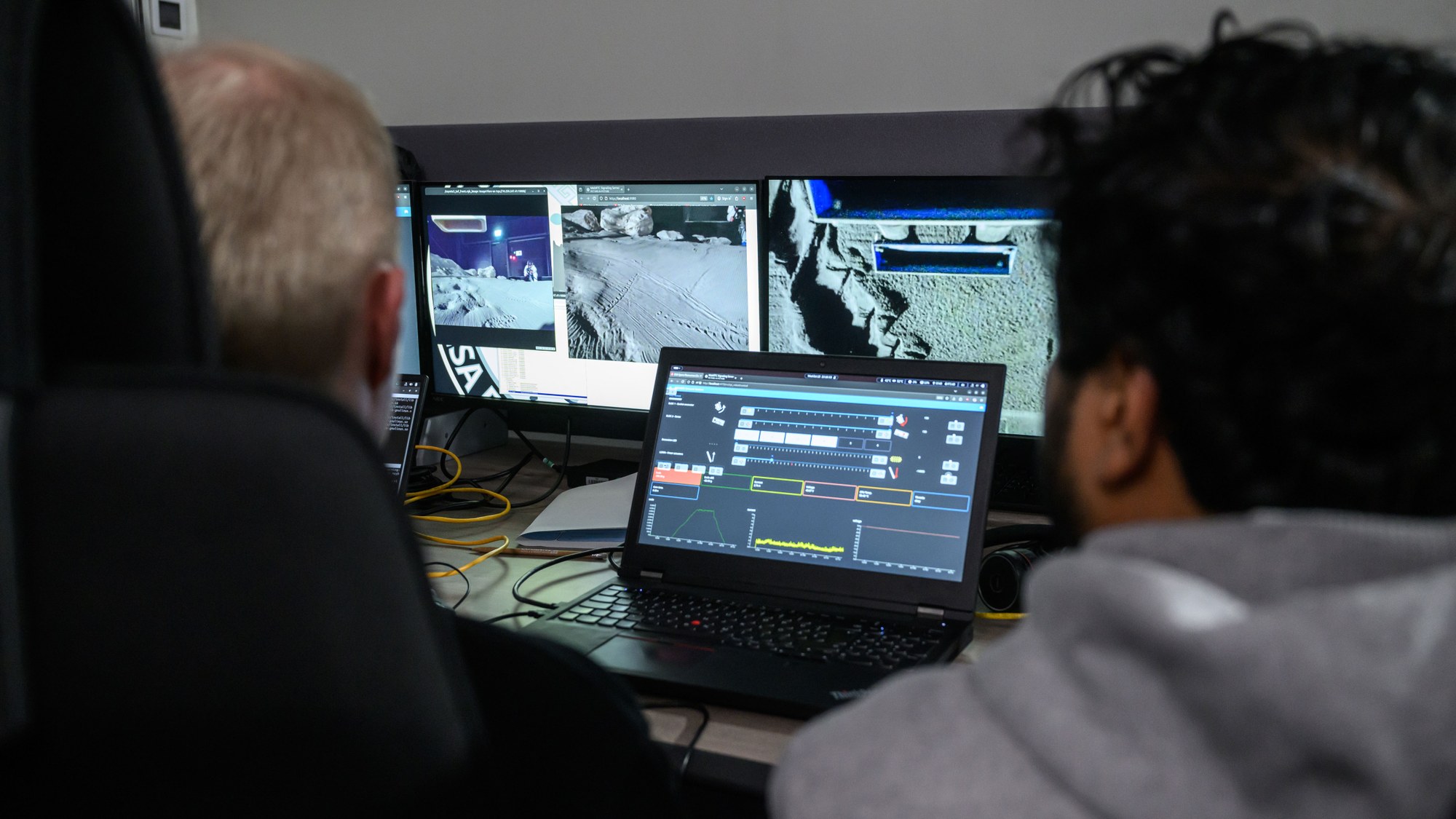 Die Teammitglieder beobachten den Test in der LUNA-Halle aus dem Leitstand