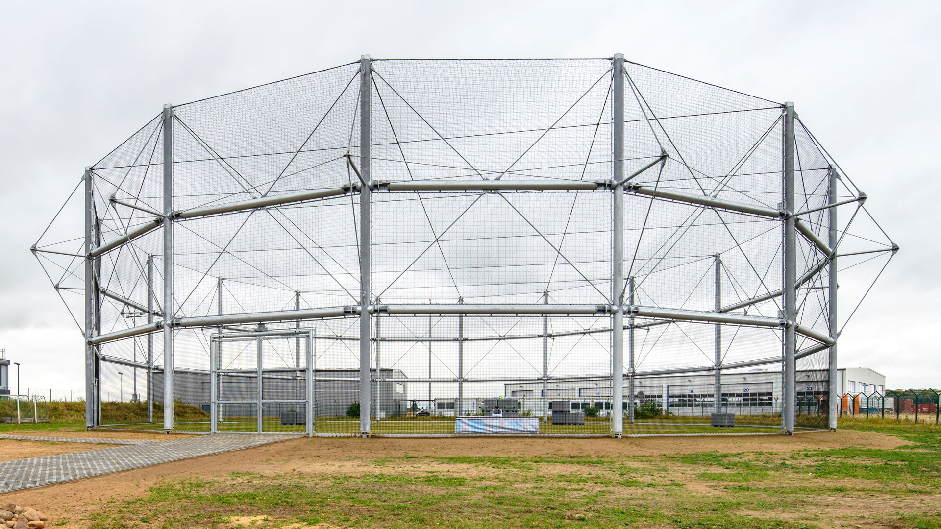 Der Käfig hat eine Grundfläche von 1.500 Quadratmetern und bietet auch Platz für Aufbauten wie Hindernisse oder Landeplätze. Über Stahlträger ist ein Netz aufgespannt, damit die Drohnen die Testumgebung nicht verlassen.