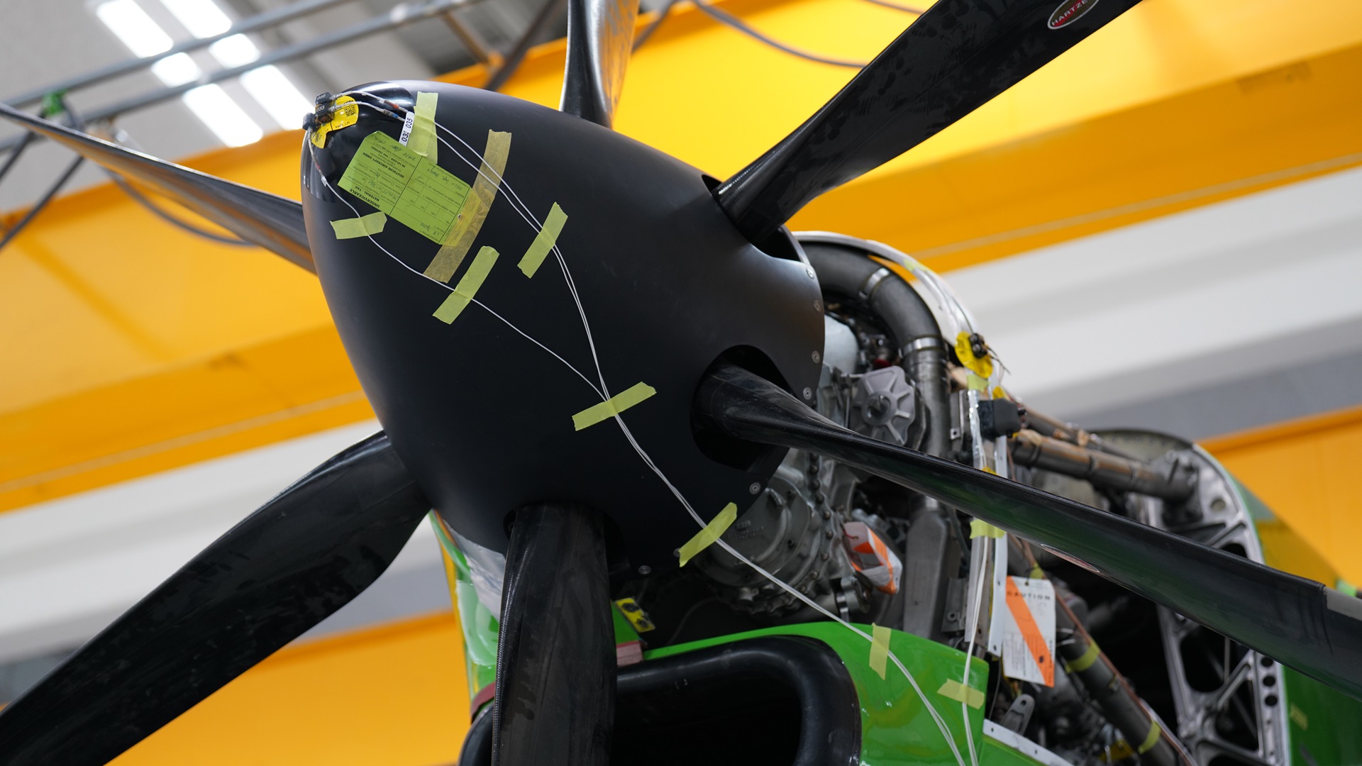 Die Beschleunigungssensoren, hier an der Propellerspitze des Triebwerks, erfassen die Eigenfrequenzen, Schwingungsformen und Dämpfungen sämtlicher Bauteile.
