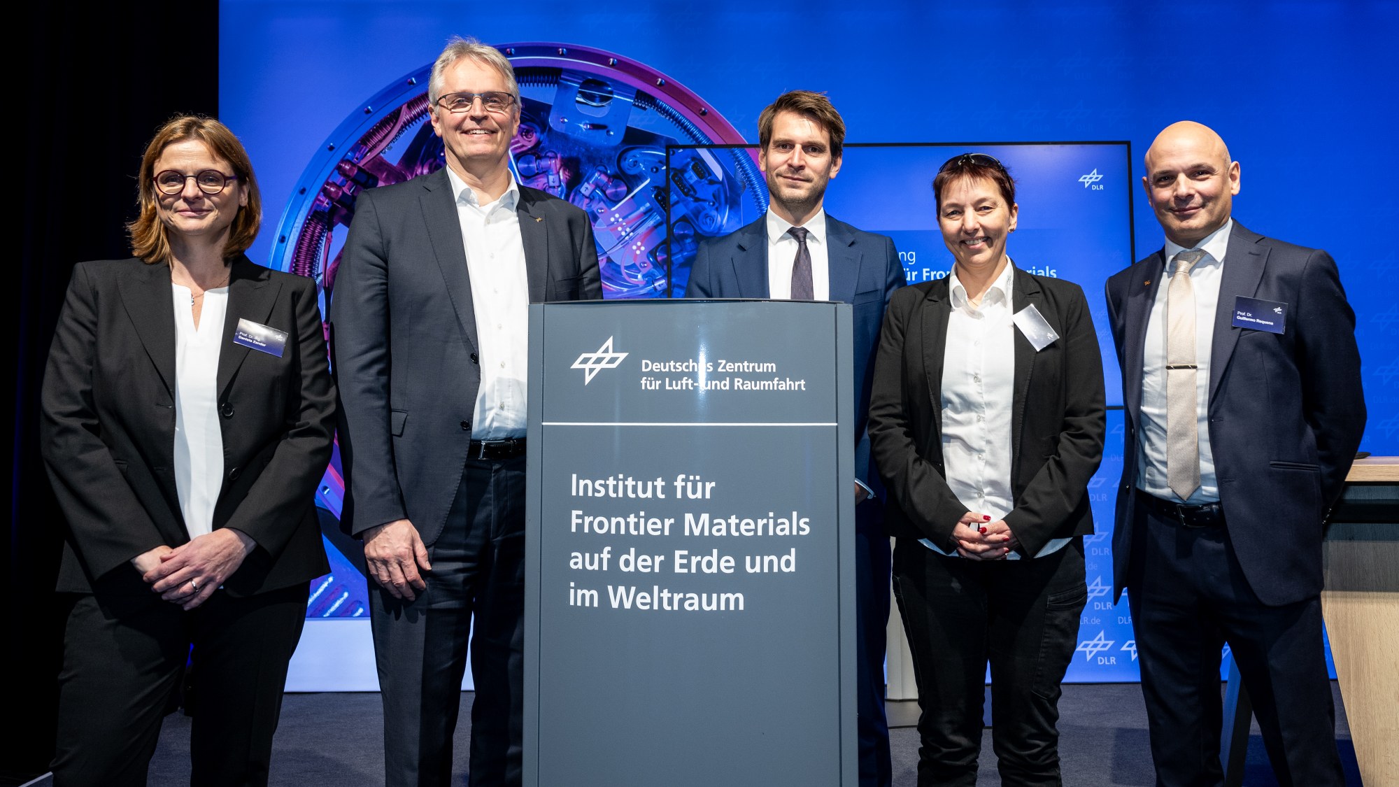 Von links: Prof. Daniela Zander, Co-Direktorin DLR-Institut für Frontier Materials, Prof. Karsten Lemmer, DLR-Vorstandsmitglied für Innovation, Transfer und wissenschaftliche Infrastrukturen, Paul Höller, Staatssekretär im NRW-Ministerium für Wirtschaft, Industrie, Klimaschutz und Energie, Dr. Anke Pagels-Kerp, DLR-Bereichsvorständin Raumfahrt und Prof. Guillermo Requena, Co-Direktor DLR-Institut für Frontier Materials.