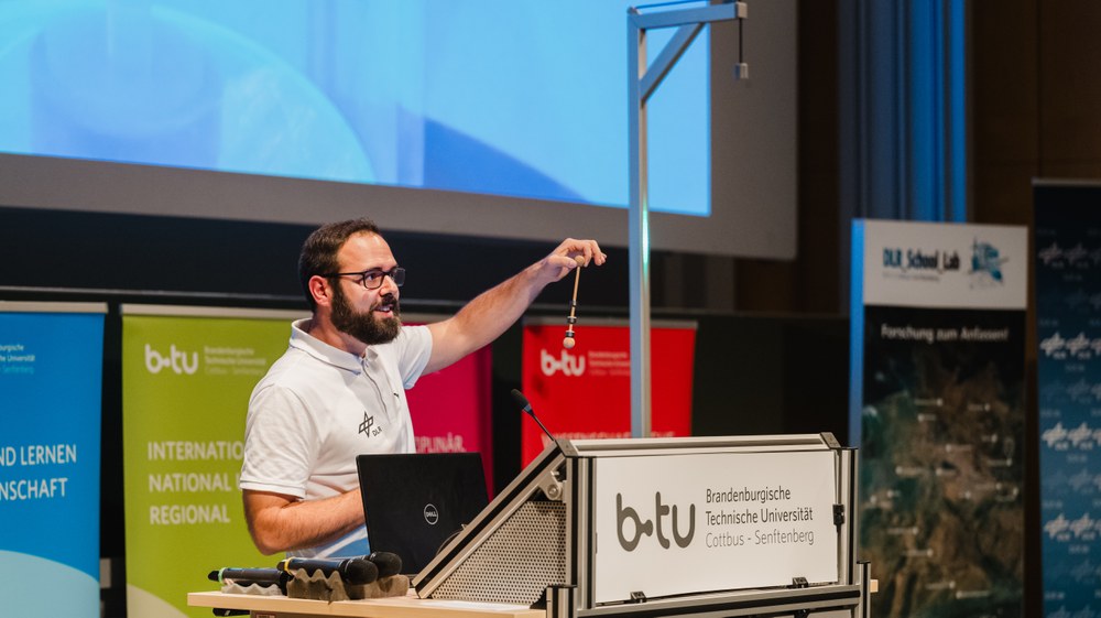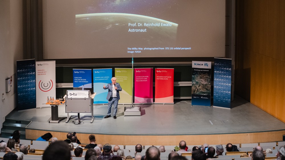Zum Auftakt der öffentlichen Vorlesungsreihe „Open BTU“ in Cottbus nahm der deutsche ESA-Astronaut Reinhold Ewald die Zuhörerinnen und Zuhörer mit auf eine Zeitreise zu den Meilensteinen der Raumfahrt. Seine Vorlesung „Raumfahrt – Für die Erde ins All“ am 15. Oktober 2025 war zugleich der Auftakt einer Reihe von Veranstaltungen der Brandenburgischen Technischen Universität Cottbus-Senftenberg, an der das Deutsche Zentrum für Luft- und Raumfahrt (DLR) beteiligt ist.