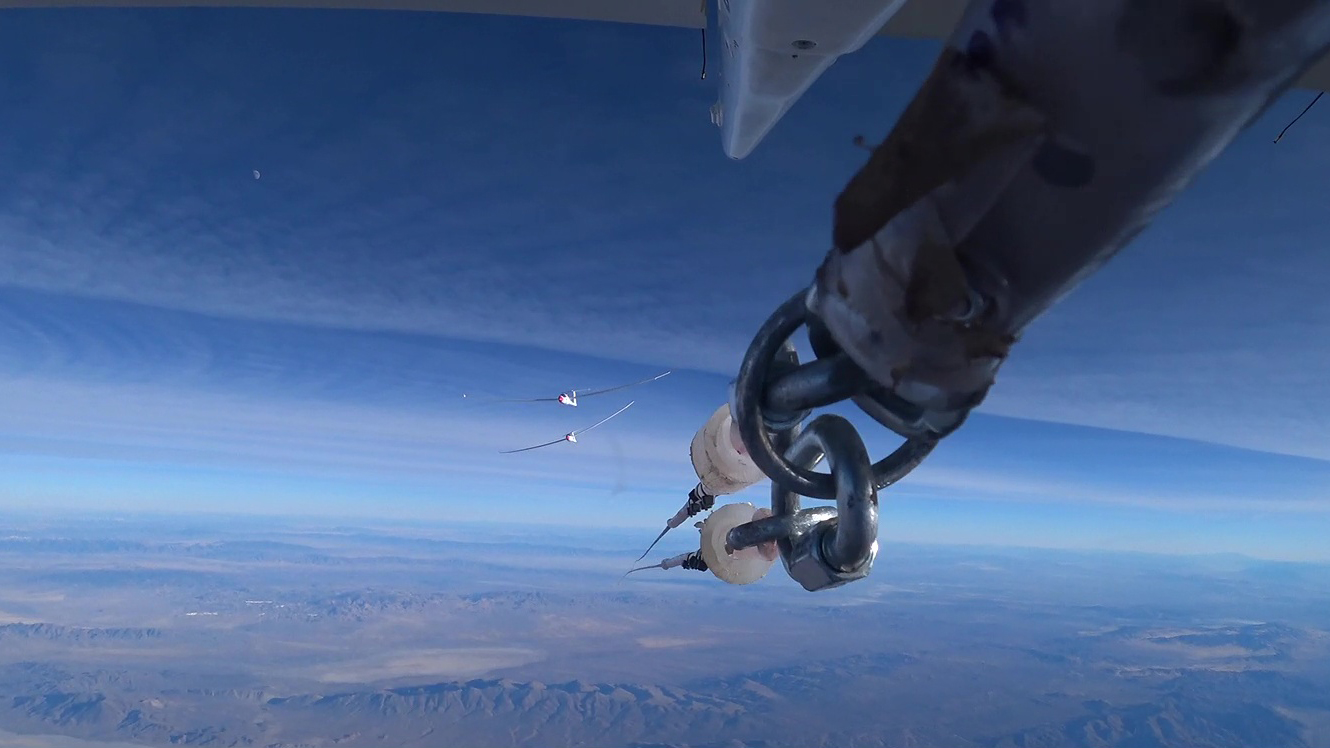 Foto von der rückwärts schauenden Kamera der Egrett nachdem der Blue-Condor-Segler vom Schlepptau der Egrett abgekoppelt wurde. Das Arcus Segelflugzeug mit dem Wasserstofftriebwerk mit einen optisch dünnen Kondensstreifen ist im Vordergrund zu sehen.