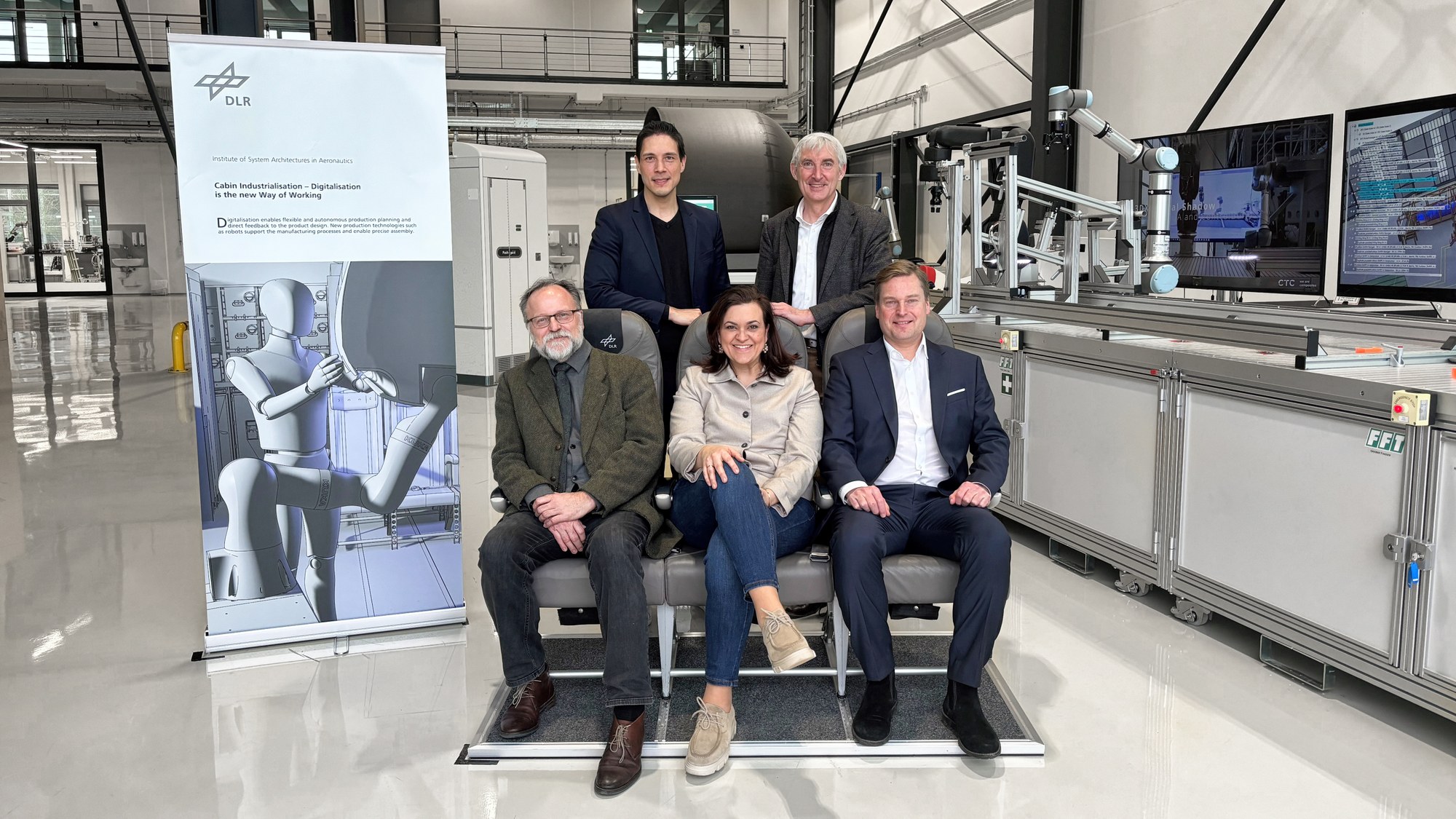 Von links: Dr. Lars Schanz, Leiter der DLR-Standorte Nord, Dr. Jörn Biedermann, DLR-Institut für Systemarchitekturen in der Luftfahrt, Franziska Hoppermann, Mitglied des Deutschen Bundestags, Prof. Gerko Wende, Direktor des DLR-Instituts für Instandhaltung und Modifikation, Dr. Björn Nagel, Direktor des DLR-Instituts für Systemarchitekturen in der Luftfahrt.