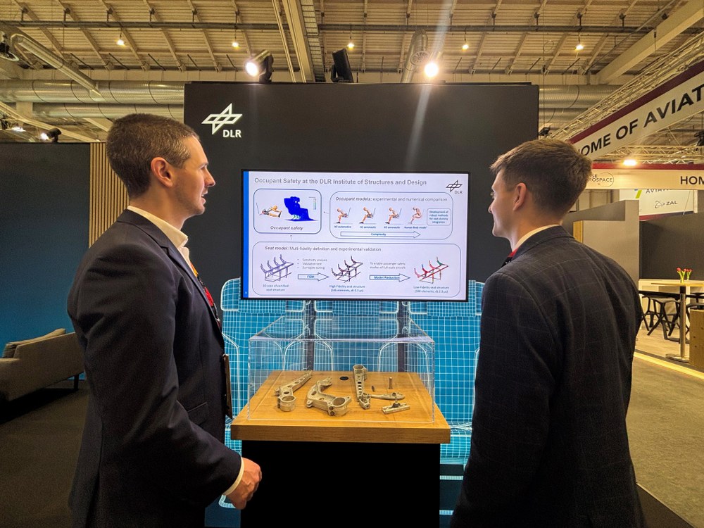 Durch den ganzheitlichen digitalen Ansatz werden die Bedürfnisse von Passagieren und Flugpersonal sowie die Anforderungen an Klimaverträglichkeit und Sicherheit von Anfang an im Designprozess miteinander verzahnt. An seinem Messestand macht das DLR diese Forschungsthemen durch die ausgestellten Exponate greifbar: